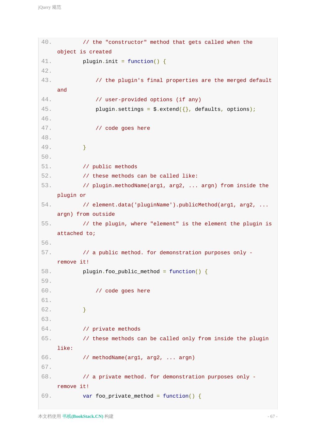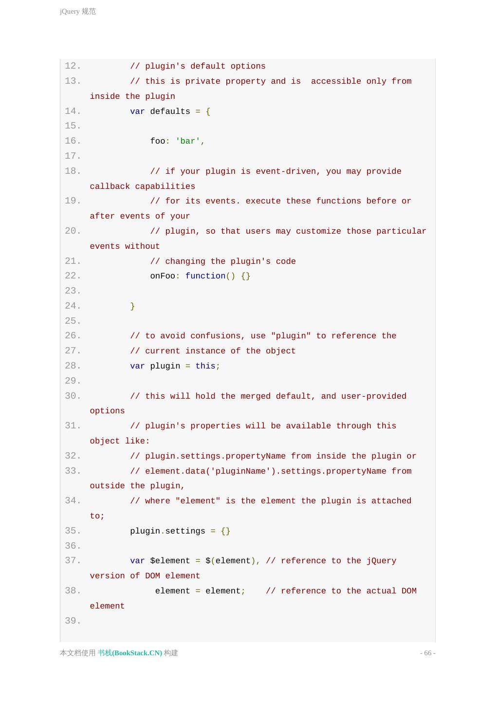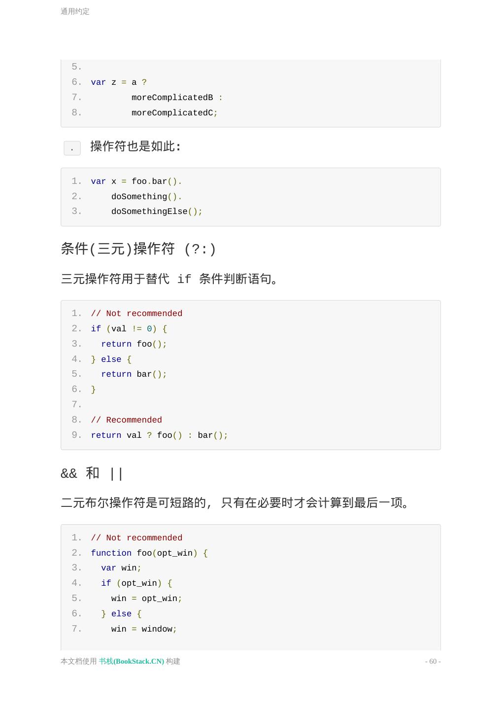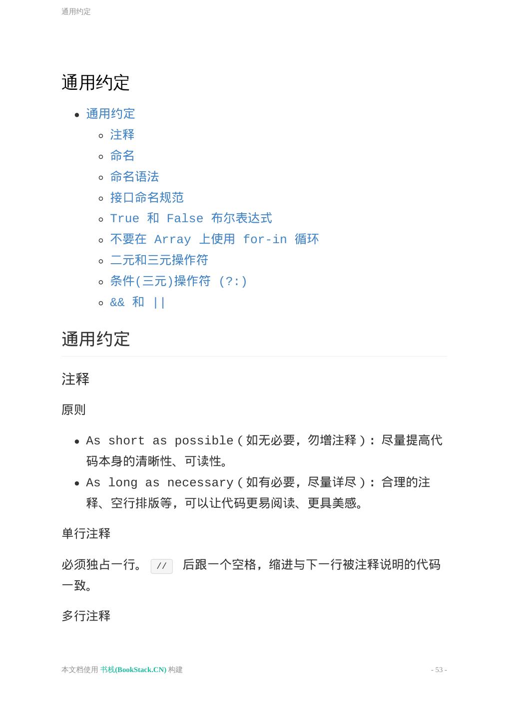 10 .基本原则 3. ============================================================================ */ 4. 5. /* 子组件块 6. ============================================================================ */ 7. .selector { 8. padding: 15px; 9. margin-bottom: 15px; 10. } 11. 12. 13. 14. /* 子组件块 15. ============================================================================ */ 16. .selector-secondary { 17. display: block; /* 注释*/ 18. } 19. 20. .selector-three { 21. display: span; 22. } JavaScript 注释 单行注释 必须独占一行。 // 后跟一个空格,缩进与下一行被注释说明的代码 一致。 多行注释 避免使用 /*...*/ 这样的多行注释。有多行注释内容时,使用多个 本文档使用 书栈(BookStack.CN) 构建 - 10 -
