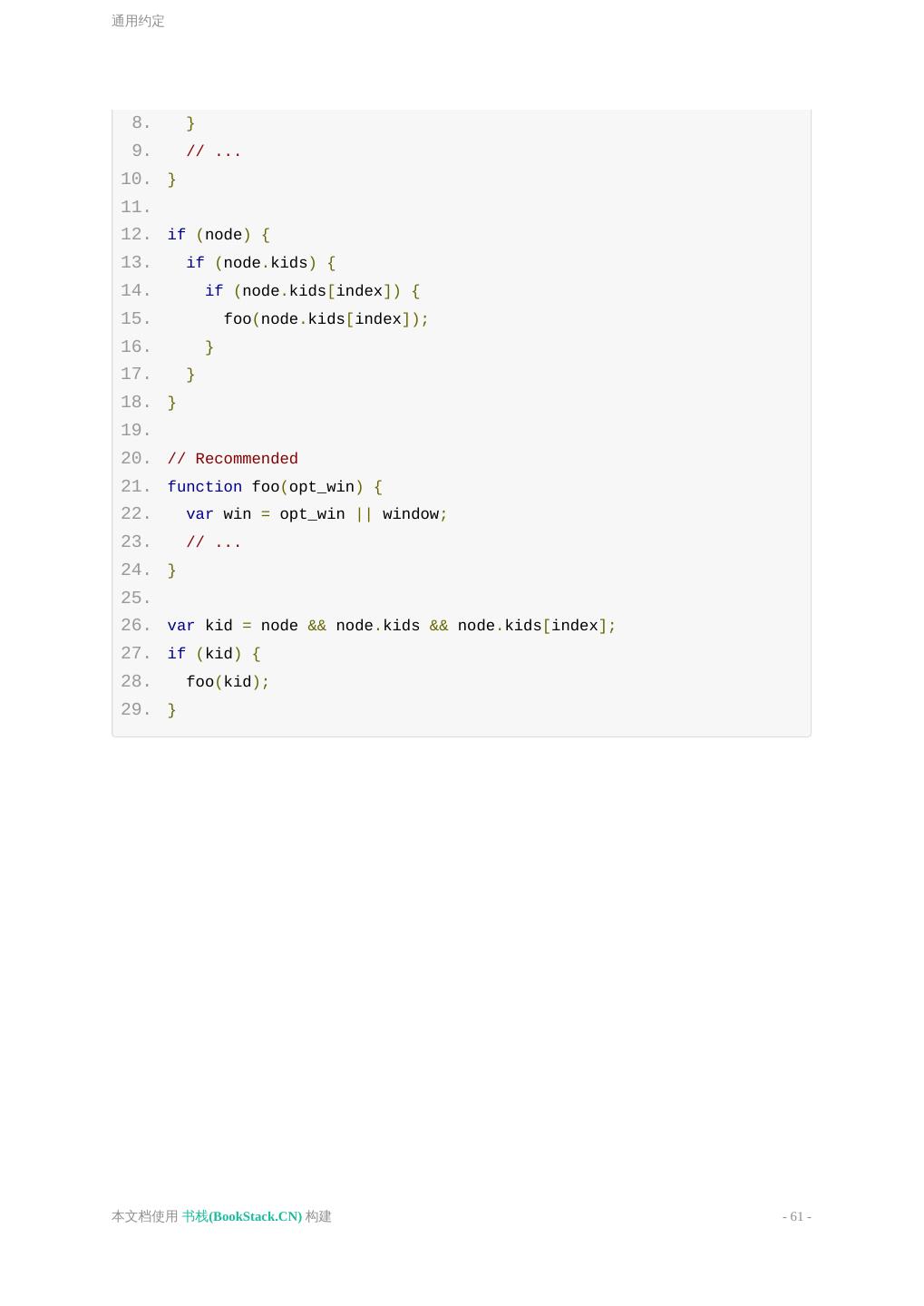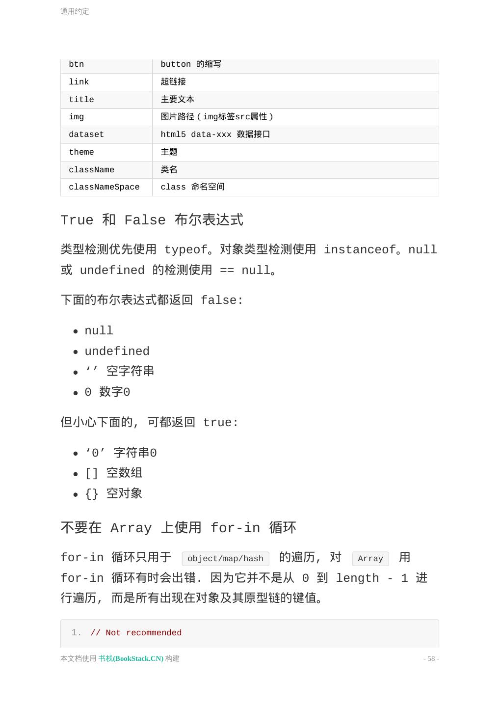 16 .通用约定 4. 5. <img src="..." alt="..."> 引号 属性的定义,统一使用双引号。 1. <!-- Not recommended --> 2. <span id='j-hook' class=text>Google</span> 3. 4. <!-- Recommended --> 5. <span id="j-hook" class="text">Google</span> 嵌套 a 不允许嵌套 div 这种约束属于语义嵌套约束,与之区别的约束还有严 格嵌套约束,比如 a 不允许嵌套 a 。 严格嵌套约束在所有的浏览器下都不被允许;而语义嵌套约束,浏览器 大多会容错处理,生成的文档树可能相互不太一样。 语义嵌套约束 <li> 用于 <ul> 或 <ol> 下; <dd> , <dt> 用于 <dl> 下; <thead> , <tbody> , <tfoot> , <tr> , <td> 用于 <table> 下; 严格嵌套约束 inline-Level 元素,仅可以包含文本或其它 inline-Level 元素; <a> 里不可以嵌套交互式元素 <a> 、 <button> 、 <select> 等; <p> 里不可以嵌套块级元素 <div> 、 <h1>~ 本文档使用 书栈(BookStack.CN) 构建 - 16 -