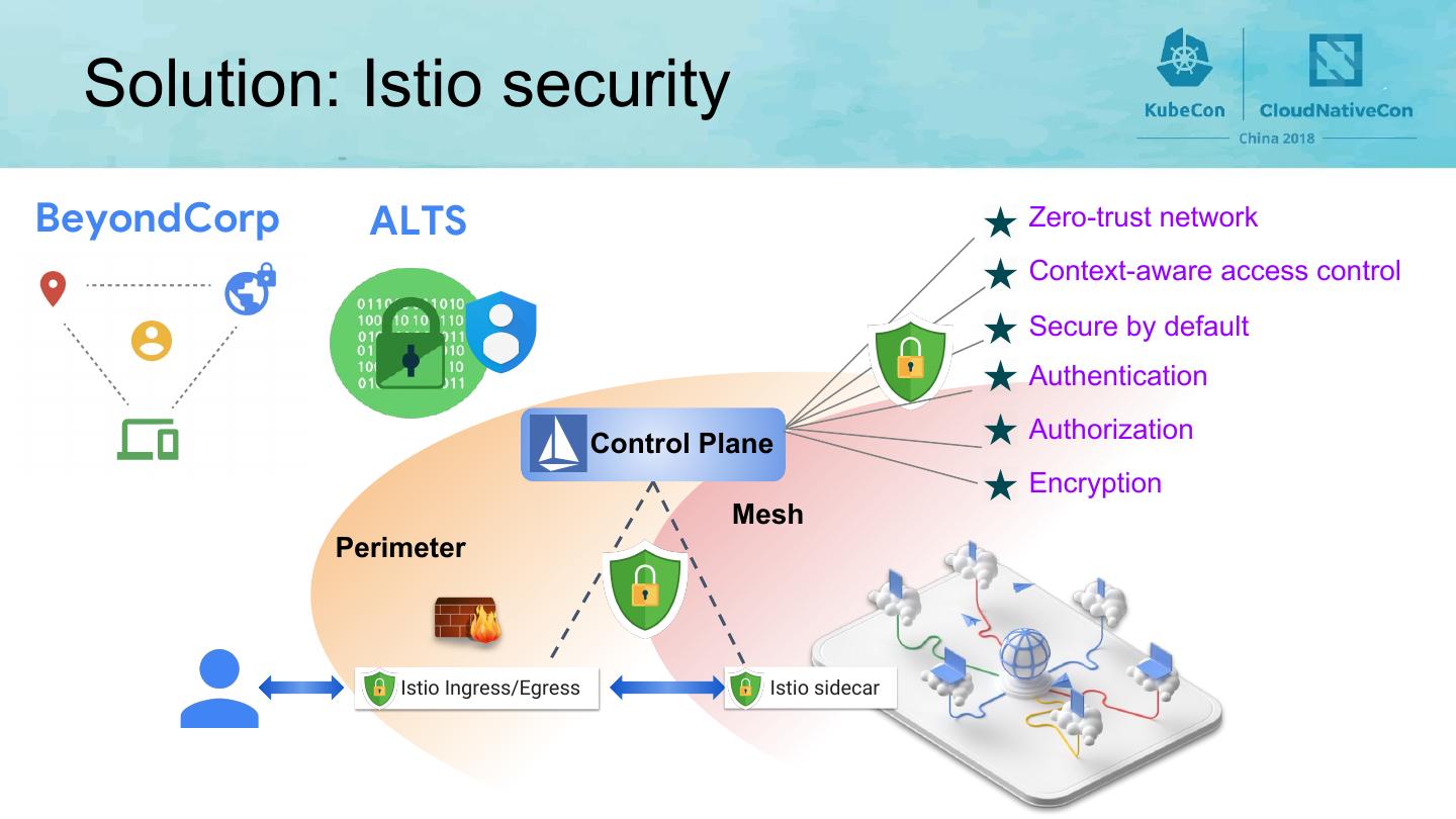 6 . Solution: Istio security BeyondCorp ALTS Zero-trust network Context-aware access control Secure by default Authentication Control Plane Authorization Encryption Mesh Perimeter Istio Ingress/Egress Istio sidecar
