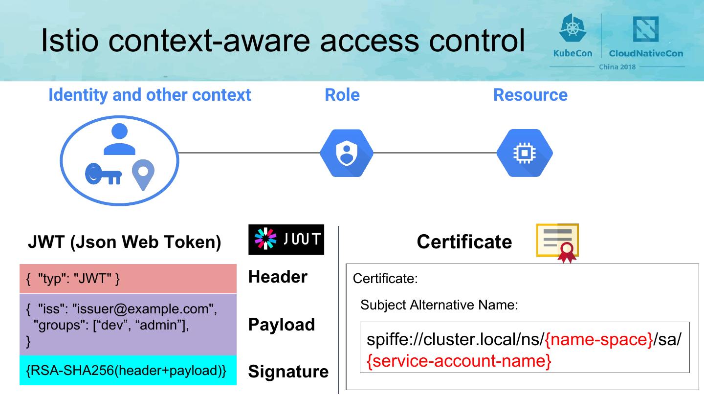 7 . Istio context-aware access control Identity and other context Role Resource JWT (Json Web Token) Certificate { "typ": "JWT" } Header Certificate: { "iss": "issuer@example.com", Subject Alternative Name: "groups": [“dev”, “admin”], Payload } spiffe://cluster.local/ns/{name-space}/sa/ {service-account-name} {RSA-SHA256(header+payload)} Signature