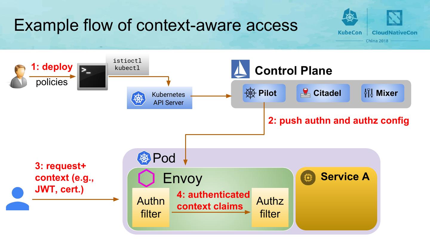 8 .Example flow of context-aware access istioctl 1: deploy kubectl Control Plane policies Kubernetes Pilot Citadel Mixer API Server 2: push authn and authz config Pod 3: request+ context (e.g., Envoy Service A JWT, cert.) 4: authenticated Authn context claims Authz filter filter