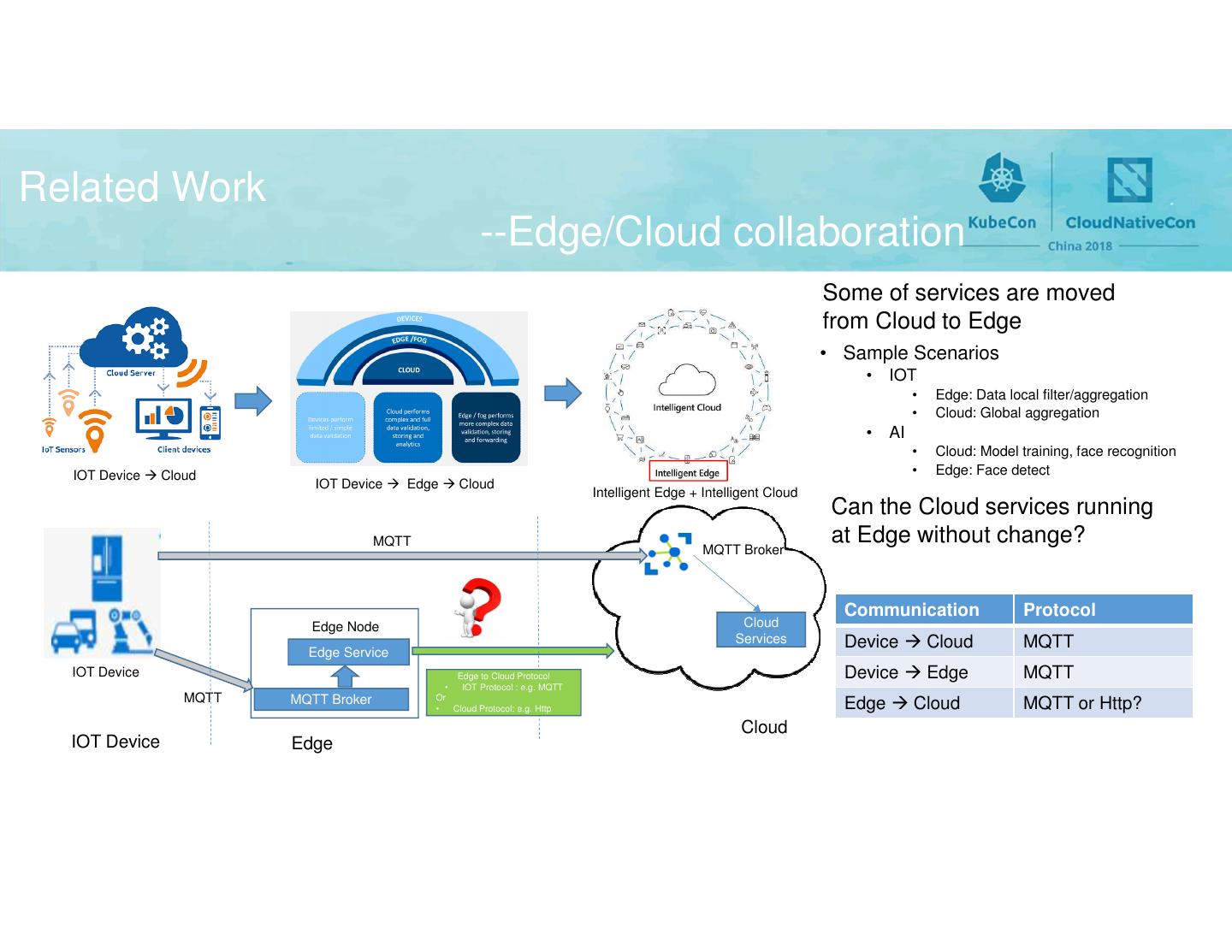 5 .Related Work --Edge/Cloud collaboration Some of services are moved from Cloud to Edge • Sample Scenarios • IOT • Edge: Data local filter/aggregation • Cloud: Global aggregation • AI • Cloud: Model training, face recognition IOT Device Cloud • Edge: Face detect IOT Device Edge Cloud Intelligent Edge + Intelligent Cloud Can the Cloud services running MQTT at Edge without change? MQTT Broker Communication Protocol Edge Node Cloud Services Device Cloud MQTT Edge Service IOT Device Edge to Cloud Protocol Device Edge MQTT • IOT Protocol : e.g. MQTT MQTT MQTT Broker Or • Cloud Protocol: e.g. Http Edge Cloud MQTT or Http? Cloud IOT Device Edge