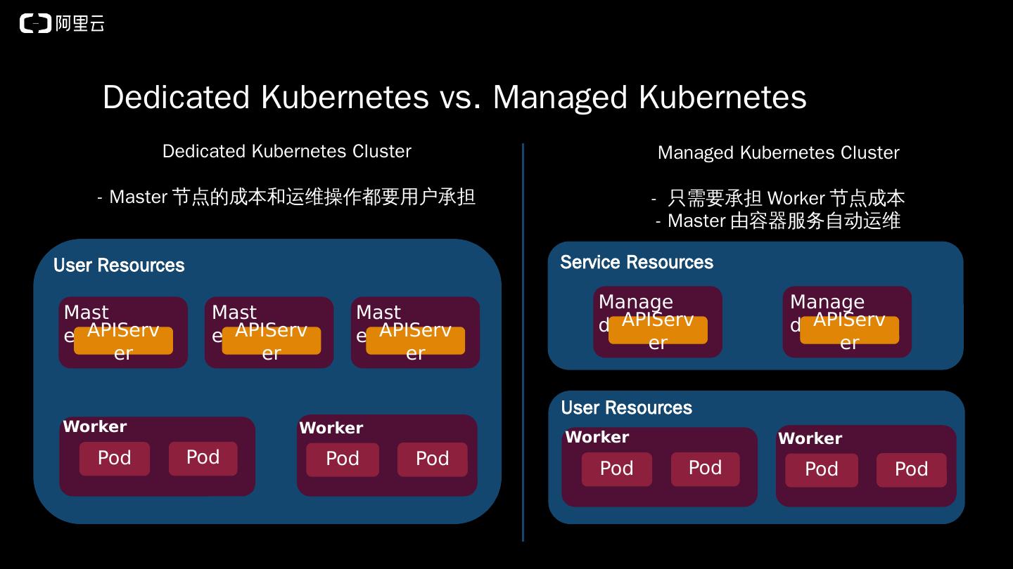 6 .Managed Kubernetes Cluster - 只需要承担 Worker 节点 成本 - Master 由容器服务自动运维 Dedicated Kubernetes Cluster - Master 节点的 成本和运维操作都要 用户 承担 Worker Pod Pod User Resources Dedicated Kubernetes vs . Managed Kubernetes Master APIServer Master APIServer Master APIServer Worker Pod Pod Worker Pod Pod Service Resources Managed APIServer Managed APIServer Worker Pod Pod User Resources