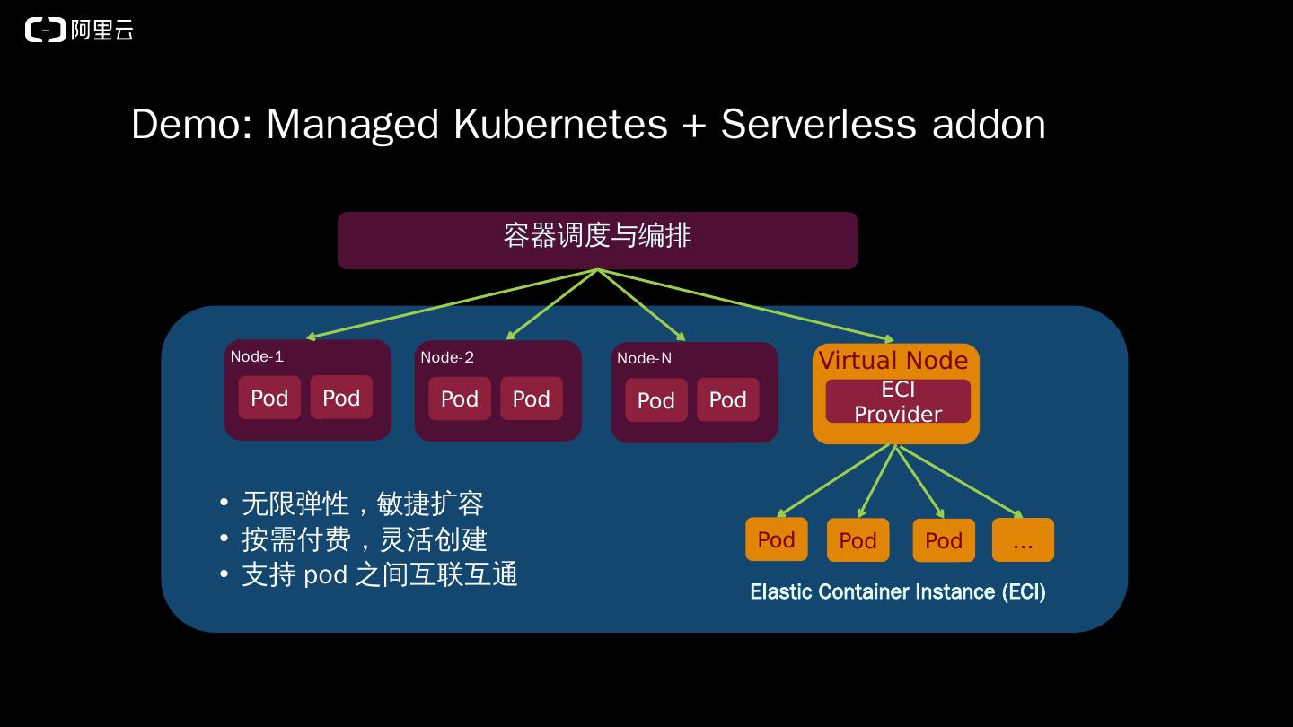 8 .Demo: Managed Kubernetes + Serverless addon 容器调度与编排 Pod Pod Pod … Elastic Container Instance (ECI) Pod Pod Node-2 Pod Pod Node-1 Pod Pod Node-N ECI Provider Virtual Node 无限弹性,敏捷扩容 按需付费,灵活创建 支持 pod 之间互联互通