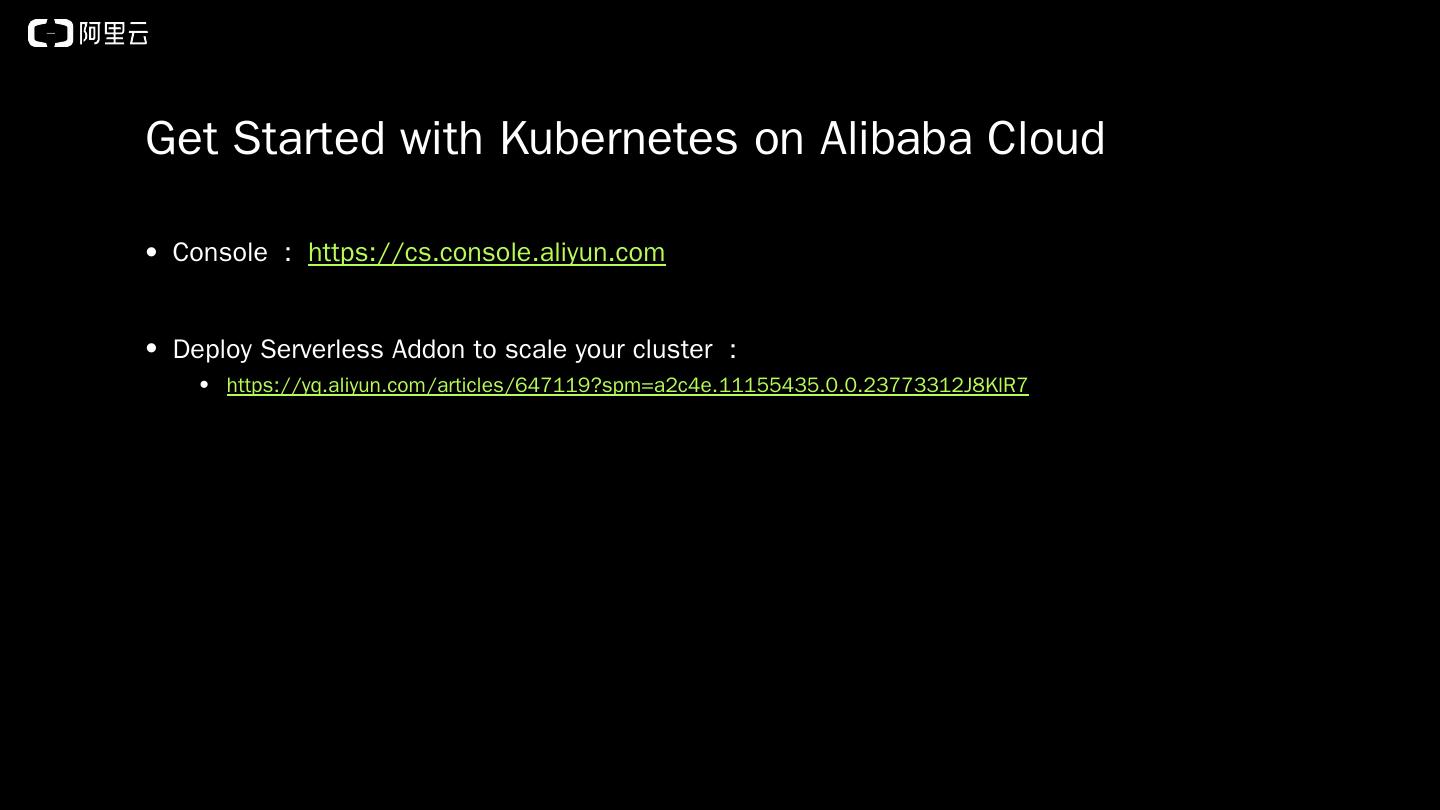 10 .Get Started with Kubernetes on Alibaba Cloud Console : https:// cs.console.aliyun.com Deploy Serverless Addon to scale your cluster : https ://yq.aliyun.com/articles/647119?spm=a2c4e. 11155435.0.0.23773312J8KlR7