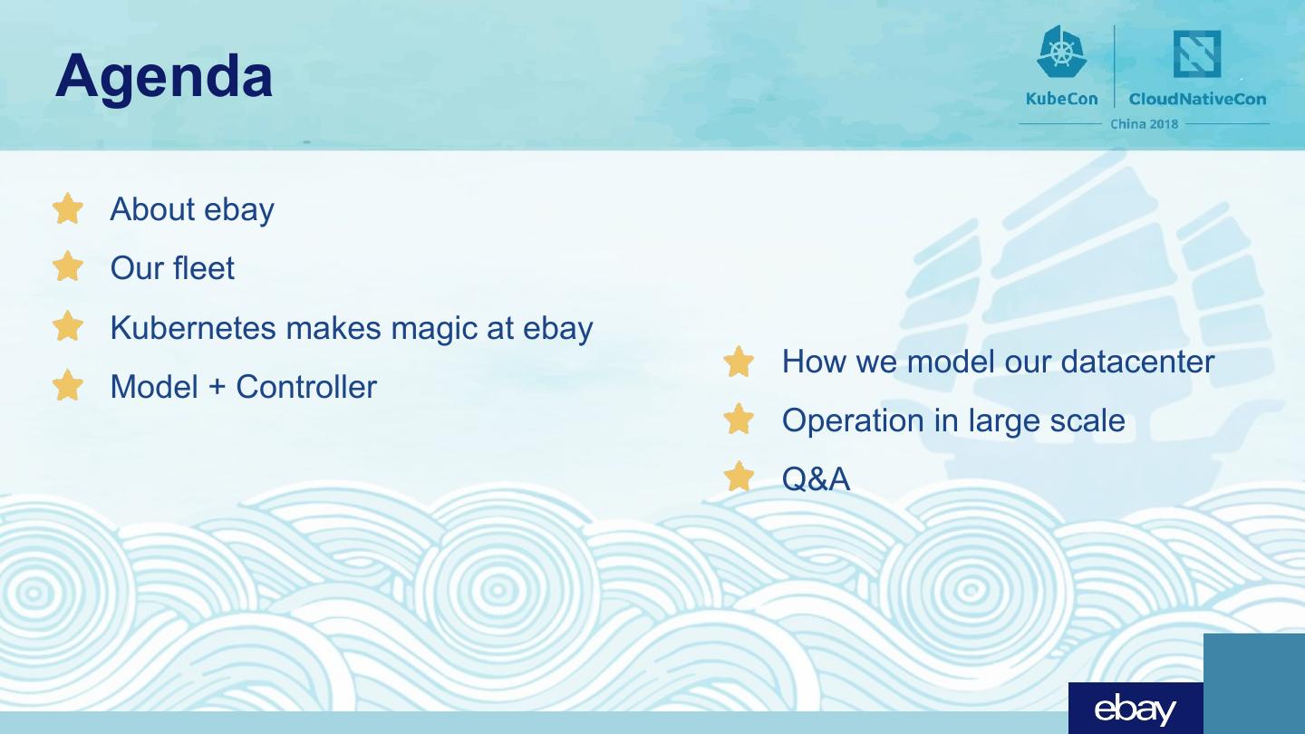 2 .Agenda About ebay Our fleet Kubernetes makes magic at ebay How we model our datacenter Model + Controller Operation in large scale Q&A
