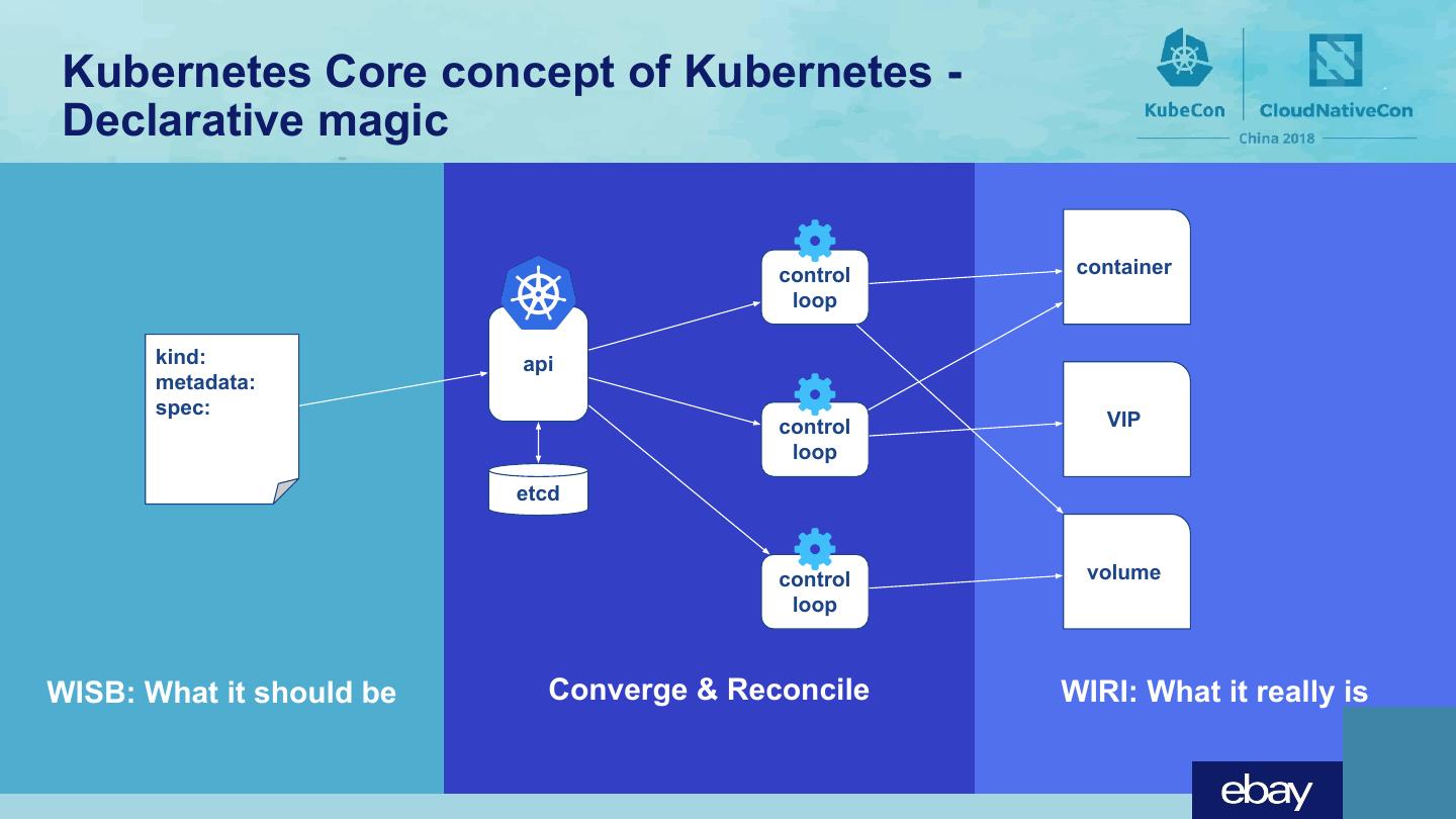 9 . Kubernetes Core concept of Kubernetes - Declarative magic control container loop kind: api metadata: spec: control VIP loop etcd control volume loop WISB: What it should be Converge & Reconcile WIRI: What it really is