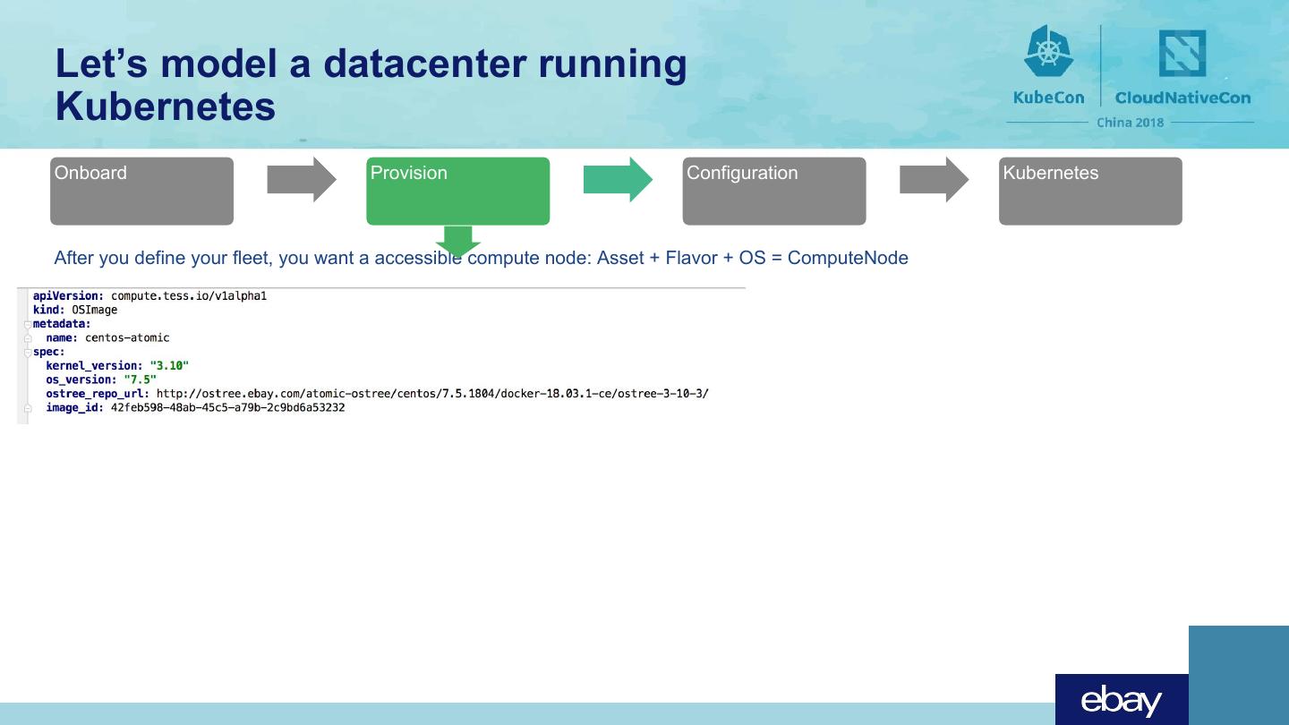 15 .Let’s model a datacenter running Kubernetes Onboard Provision Configuration Kubernetes After you define your fleet, you want a accessible compute node: Asset + Flavor + OS = ComputeNode