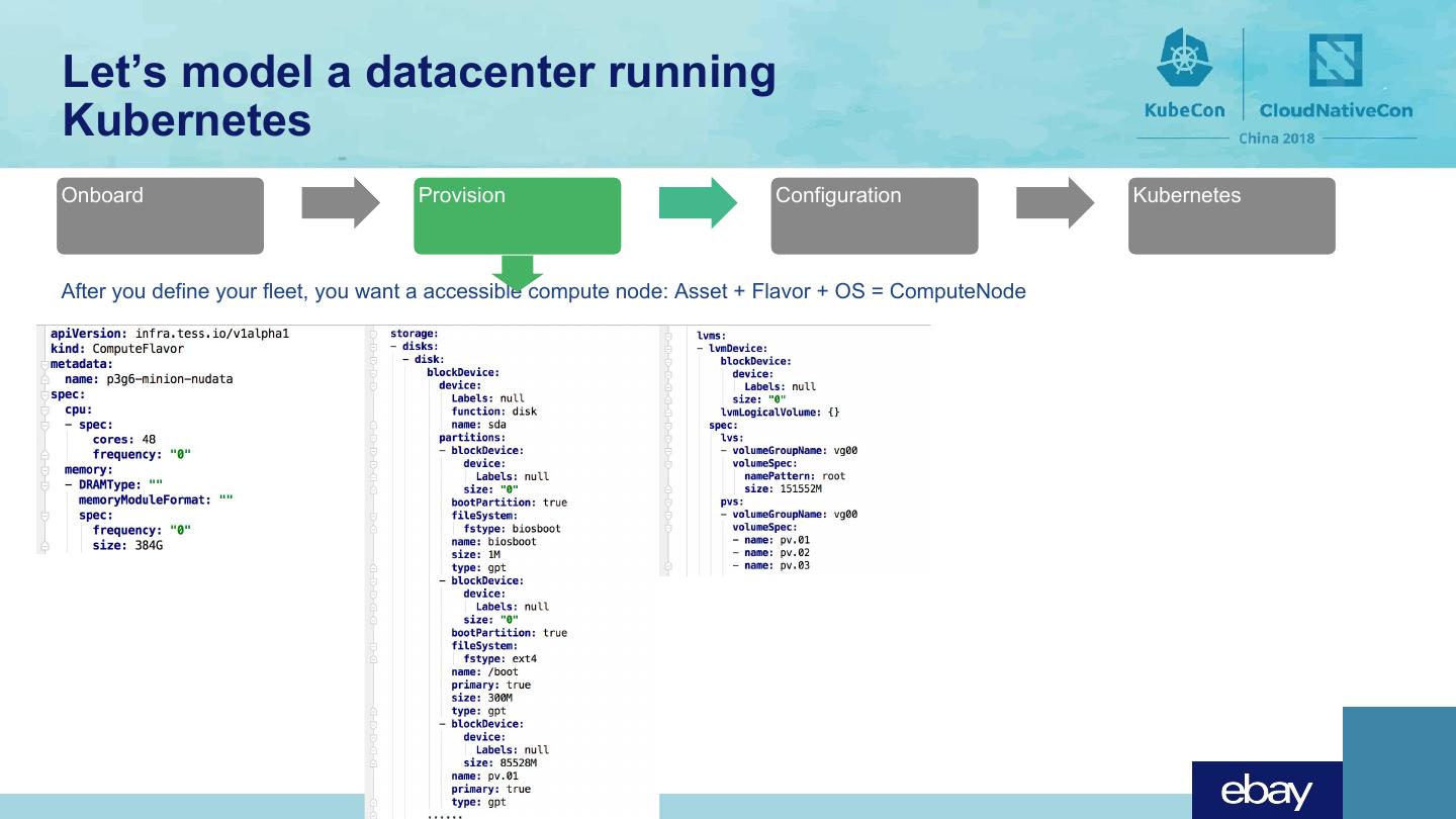 17 .Let’s model a datacenter running Kubernetes Onboard Provision Configuration Kubernetes You have your compute node now, all you need is to configure it by a configuration management orchestration. We use SaltStack.