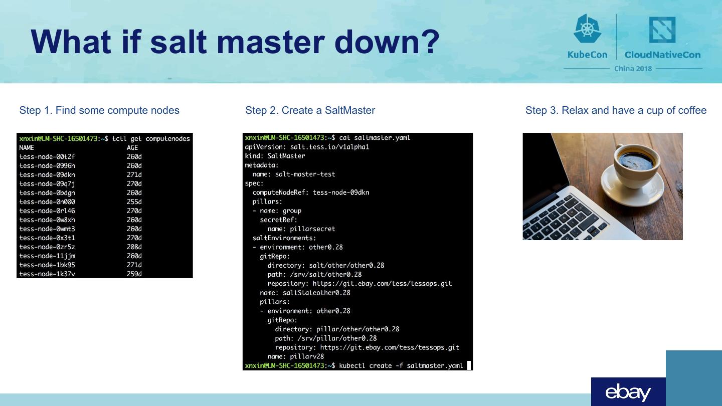 21 . What if salt master down? Step 1. Find some compute nodes Step 2. Create a SaltMaster Step 3. Relax and have a cup of coffee