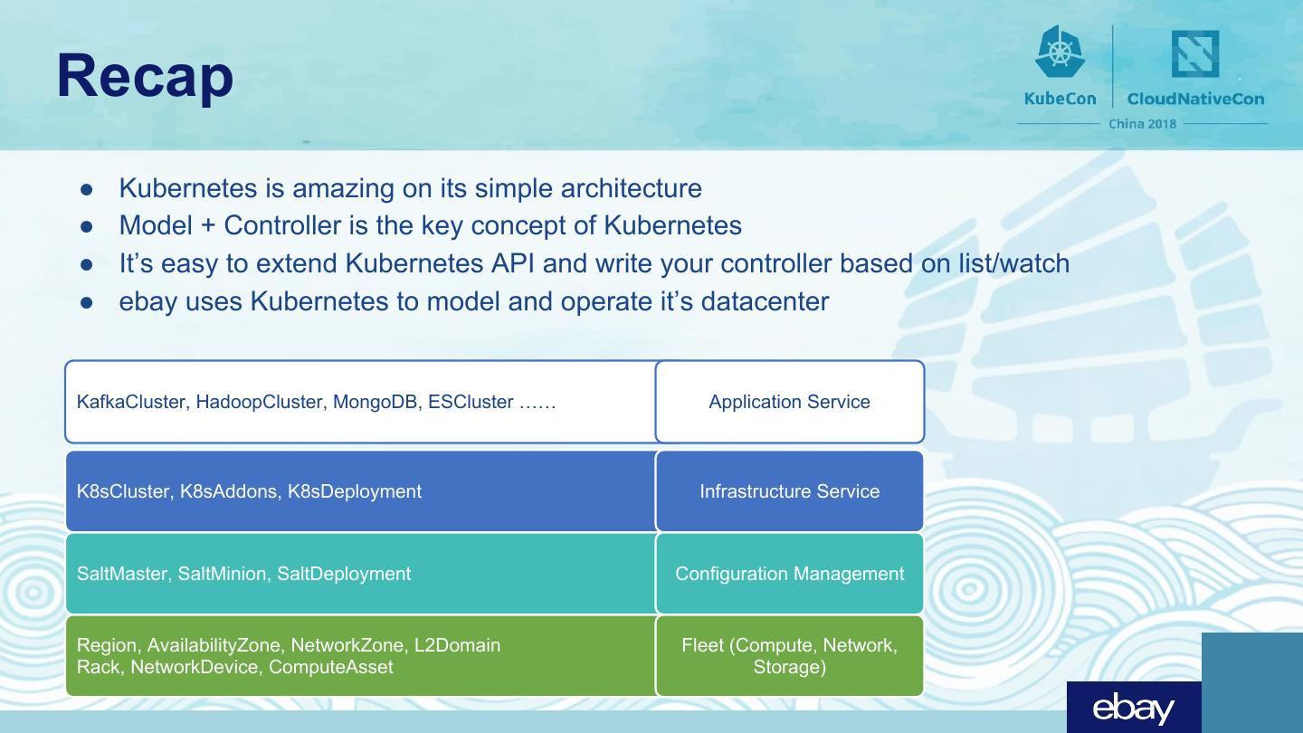 23 .Recap ● Kubernetes is amazing on its simple architecture ● Model + Controller is the key concept of Kubernetes ● It’s easy to extend Kubernetes API and write your controller based on list/watch ● ebay uses Kubernetes to model and operate it’s datacenter KafkaCluster, HadoopCluster, MongoDB, ESCluster …… Application Service K8sCluster, K8sAddons, K8sDeployment Infrastructure Service SaltMaster, SaltMinion, SaltDeployment Configuration Management Region, AvailabilityZone, NetworkZone, L2Domain Fleet (Compute, Network, Rack, NetworkDevice, ComputeAsset Storage)