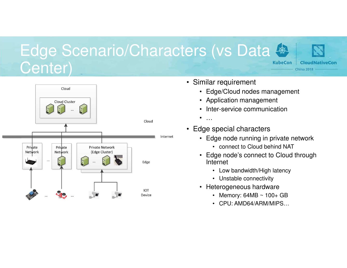3 .Edge Scenario/Characters (vs Data Center) • Similar requirement • Edge/Cloud nodes management • Application management • Inter-service communication • … • Edge special characters • Edge node running in private network • connect to Cloud behind NAT • Edge node’s connect to Cloud through Internet • Low bandwidth/High latency • Unstable connectivity • Heterogeneous hardware • Memory: 64MB ~ 100+ GB • CPU: AMD64/ARM/MIPS…