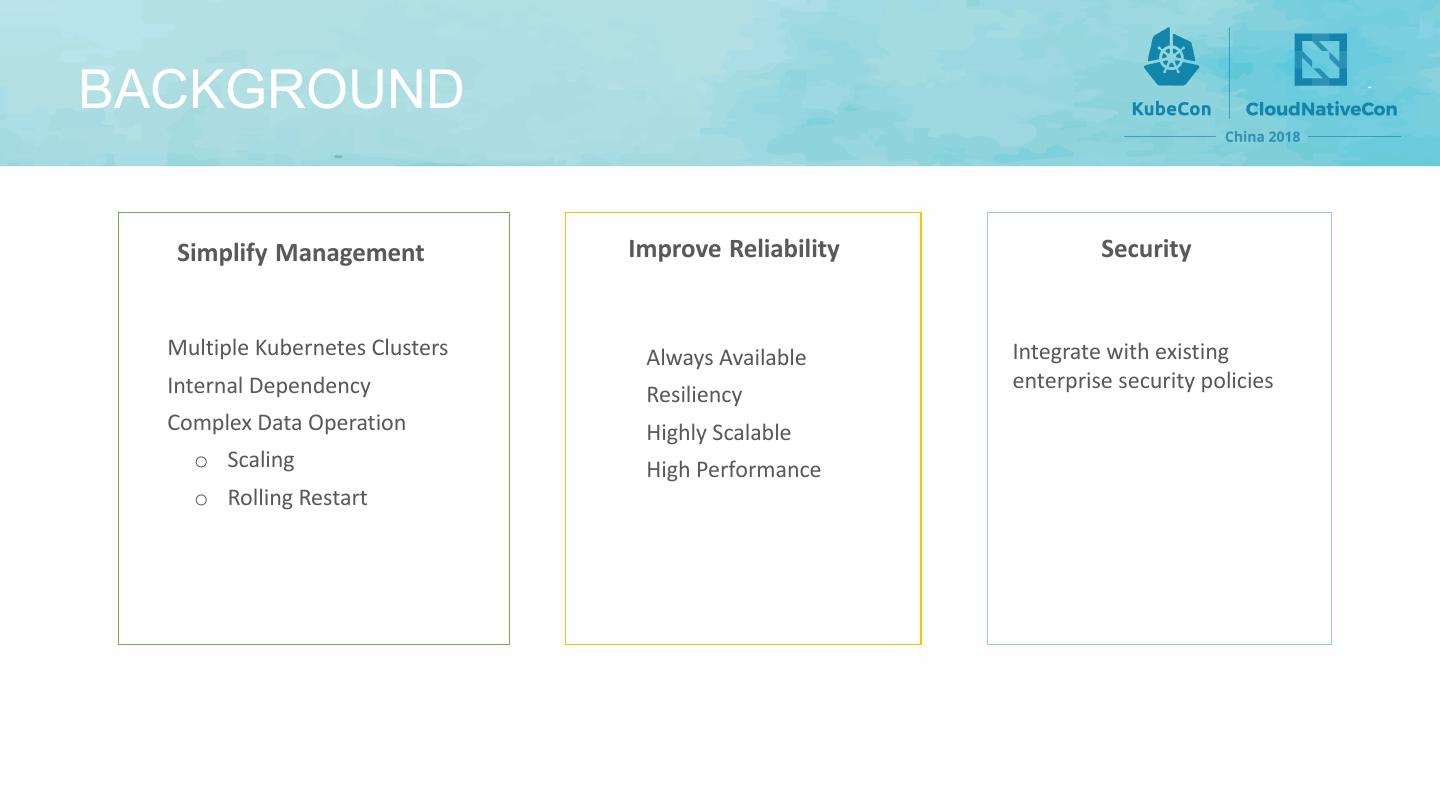 6 .BACKGROUND Simplify Management Improve Reliability Security Multiple Kubernetes Clusters Always Available Integrate with existing Internal Dependency enterprise security policies Resiliency Complex Data Operation Highly Scalable o Scaling High Performance o Rolling Restart