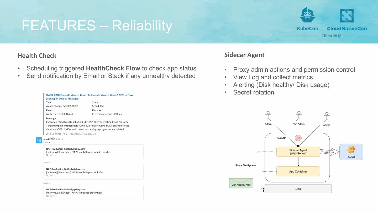 14 . FEATURES – Reliability Health Check Sidecar Agent • Scheduling triggered HealthCheck Flow to check app status • Proxy admin actions and permission control • Send notification by Email or Stack if any unhealthy detected • View Log and collect metrics • Alerting (Disk healthy/ Disk usage) • Secret rotation