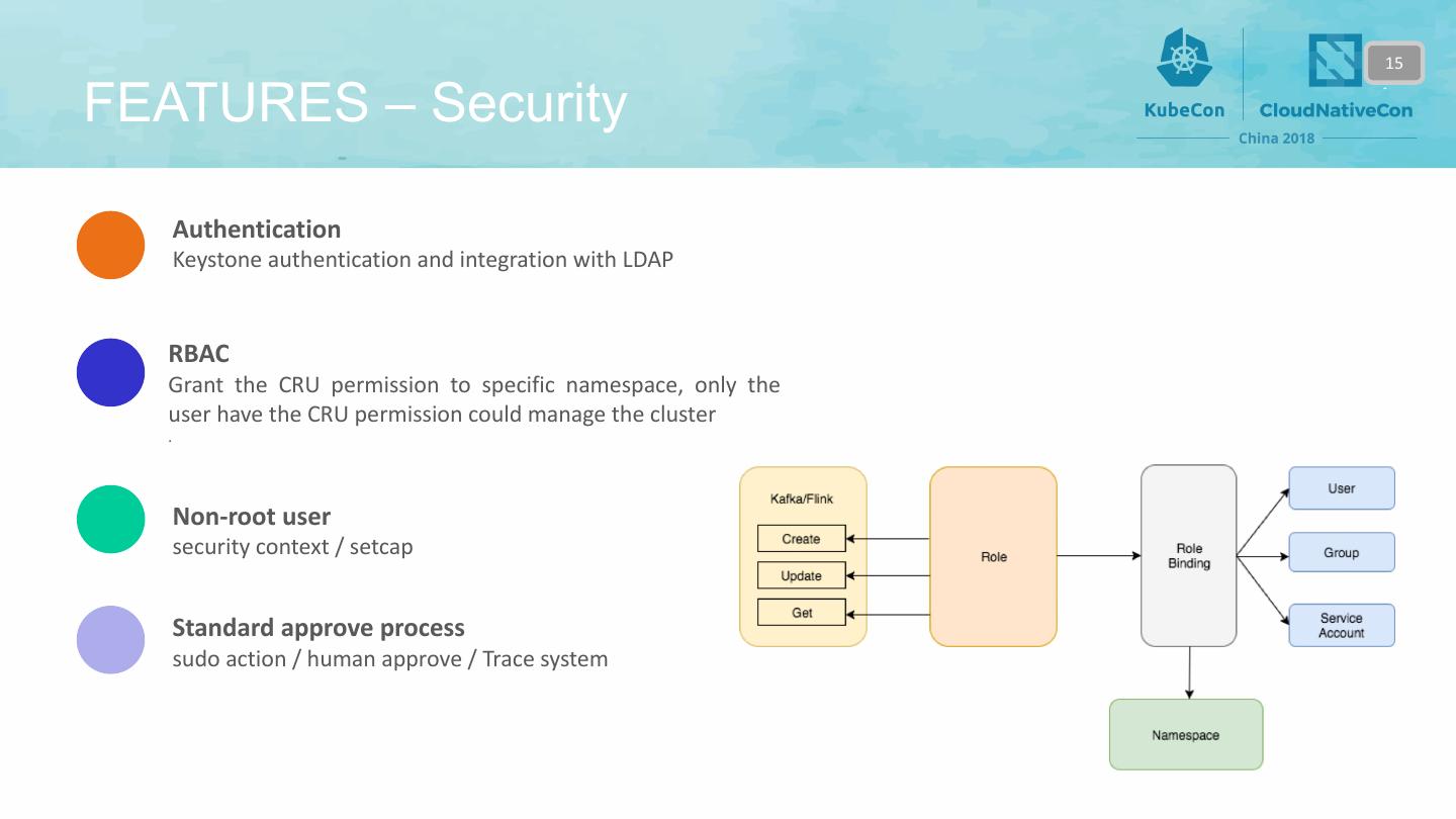 15 . 15 FEATURES – Security Authentication Keystone authentication and integration with LDAP RBAC Grant the CRU permission to specific namespace, only the user have the CRU permission could manage the cluster . Non-root user security context / setcap Standard approve process sudo action / human approve / Trace system