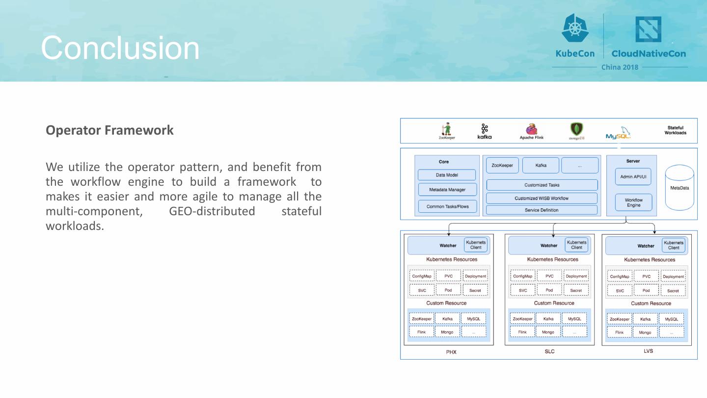 16 .Conclusion Operator Framework We utilize the operator pattern, and benefit from the workflow engine to build a framework to makes it easier and more agile to manage all the multi-component, GEO-distributed stateful workloads.