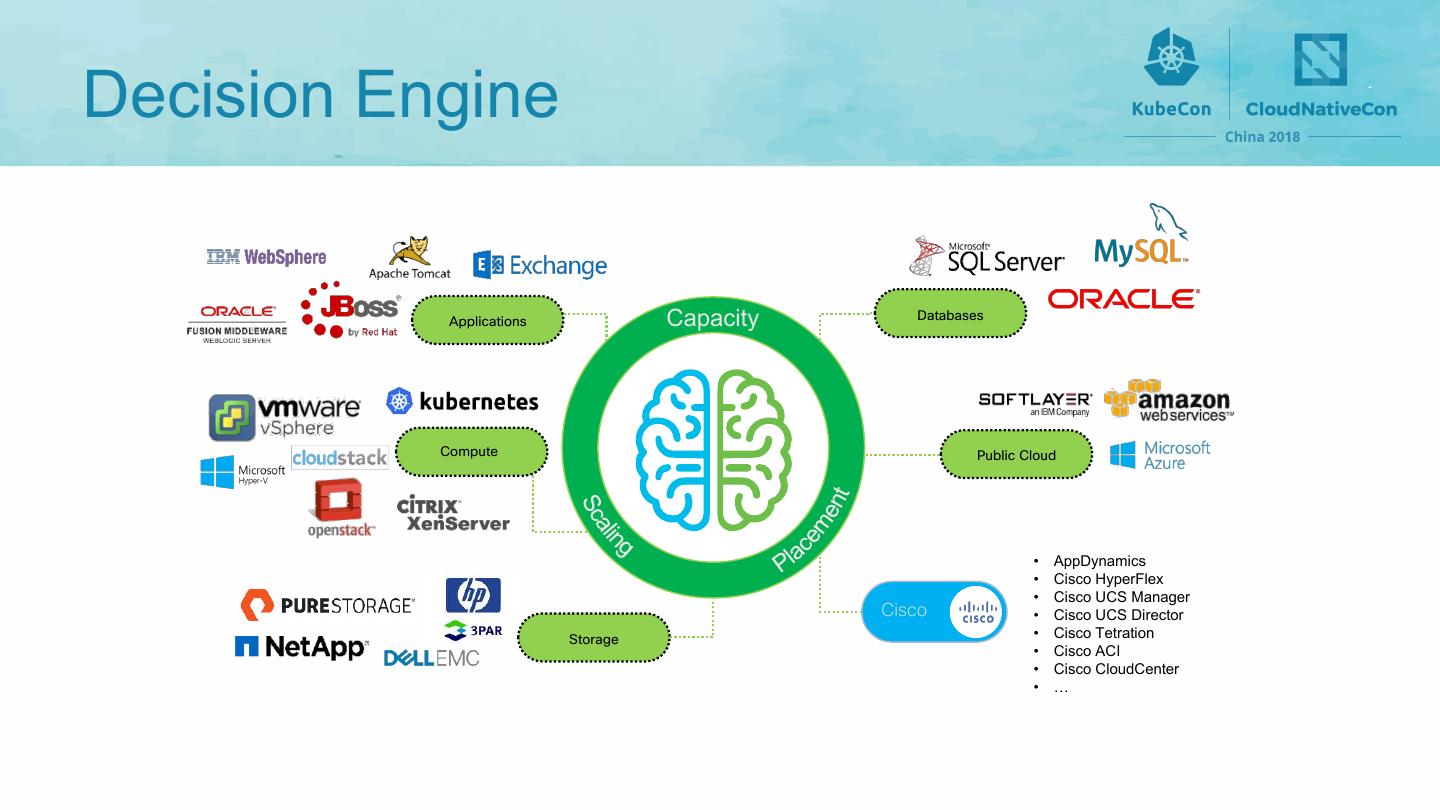 14 .Decision Engine Applications Capacity Databases Compute Public Cloud • AppDynamics • Cisco HyperFlex • Cisco UCS Manager Cisco • Cisco UCS Director Storage • Cisco Tetration • Cisco ACI • Cisco CloudCenter • …