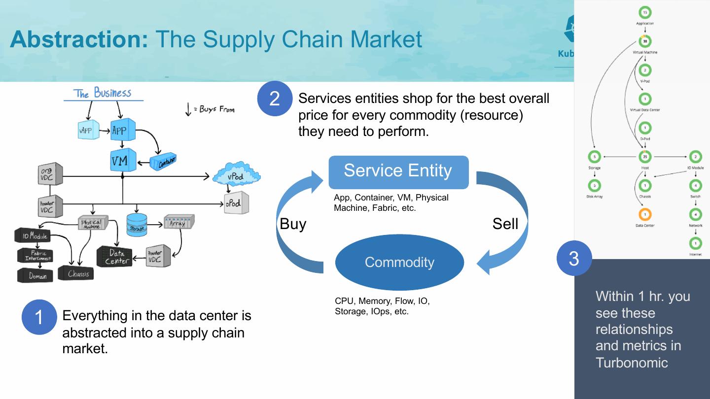 15 .Abstraction: The Supply Chain Market 2• Services entities shop for the best overall price for every commodity (resource) they need to perform. Service Entity App, Container, VM, Physical Machine, Fabric, etc. Buy Sell Commodity 3 CPU, Memory, Flow, IO, Within 1 hr. you 1• Everything in the data center is Storage, IOps, etc. see these abstracted into a supply chain relationships market. and metrics in Turbonomic