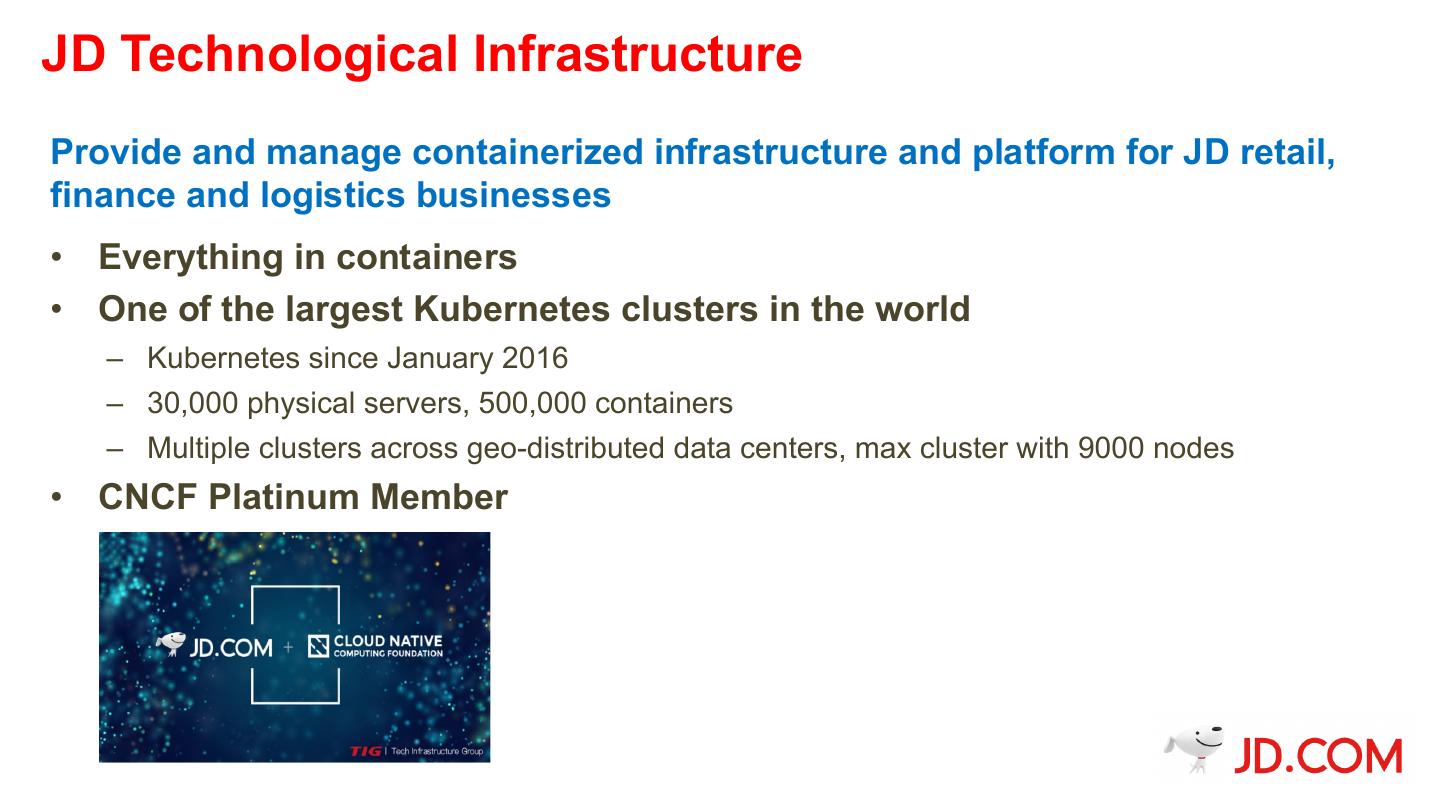 3 .JD Technological Infrastructure Provide and manage containerized infrastructure and platform for JD retail, finance and logistics businesses • Everything in containers • One of the largest Kubernetes clusters in the world – Kubernetes since January 2016 – 30,000 physical servers, 500,000 containers – Multiple clusters across geo-distributed data centers, max cluster with 9000 nodes • CNCF Platinum Member