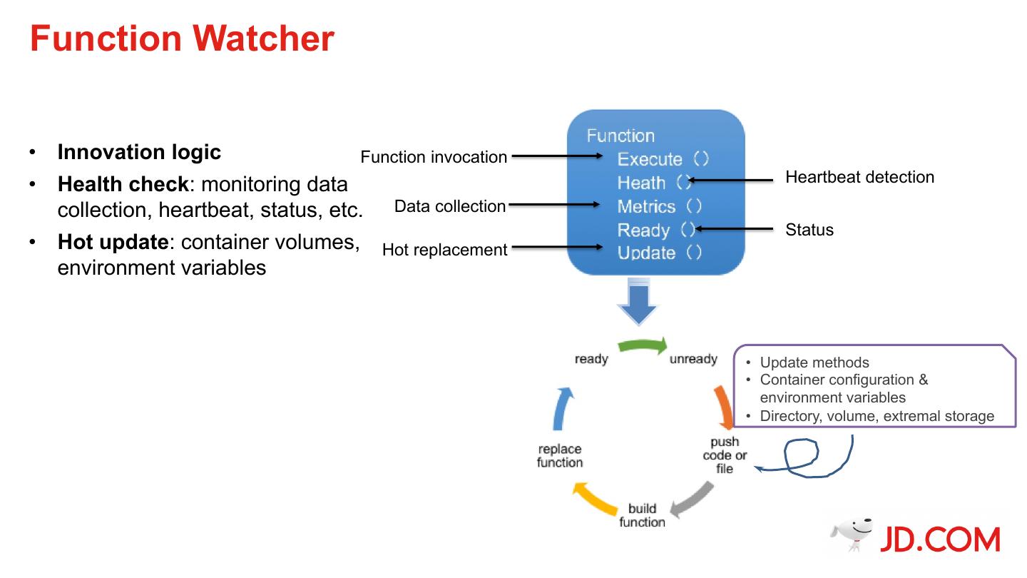 16 .Function Watcher • Innovation logic Function invocation • Health check: monitoring data Heartbeat detection collection, heartbeat, status, etc. Data collection Status • Hot update: container volumes, Hot replacement environment variables • Update methods • Container configuration & environment variables • Directory, volume, extremal storage