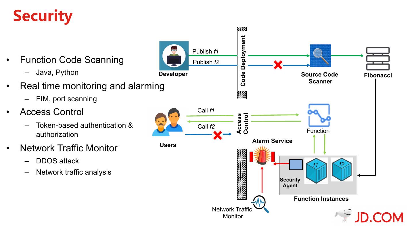 21 . Code Deployment Publish f1 • Function Code Scanning Publish f2 – Java, Python Developer Source Code Fibonacci Scanner • Real time monitoring and alarming – FIM, port scanning • Access Control Call f1 Control Access – Token-based authentication & Call f2 Function authorization Alarm Service Users • Network Traffic Monitor – DDOS attack f1 f2 – Network traffic analysis Security Agent Function Instances Network Traffic Monitor