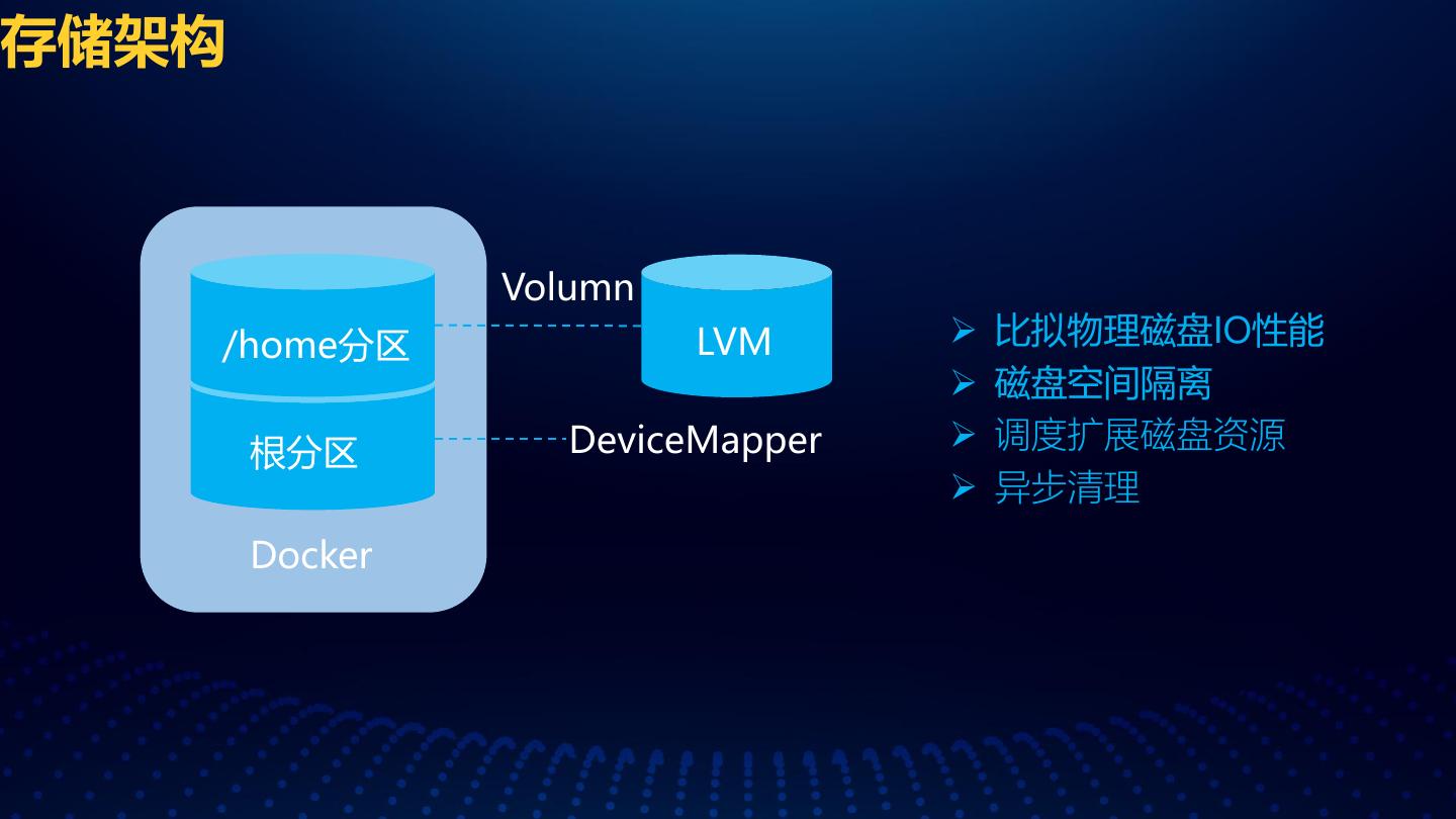 6 .存储架构 Volumn /home分区 LVM 比拟物理磁盘IO性能 磁盘空间隔离 根分区 DeviceMapper 调度扩展磁盘资源 异步清理 Docker