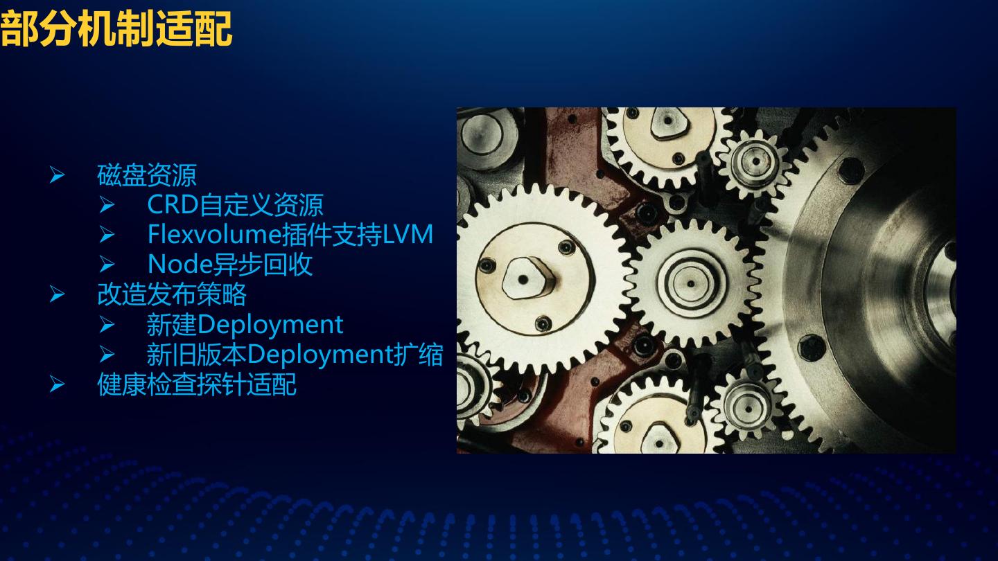19 .部分机制适配 磁盘资源 CRD自定义资源 Flexvolume插件支持LVM Node异步回收 改造发布策略 新建Deployment 新旧版本Deployment扩缩 健康检查探针适配