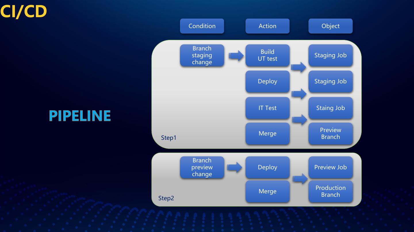 22 .CI/CD Condition Action Object Branch Build staging Staging Job UT test change Deploy Staging Job IT Test Staing Job Preview Merge Step1 Branch Branch preview Deploy Preview Job change Production Merge Branch Step2