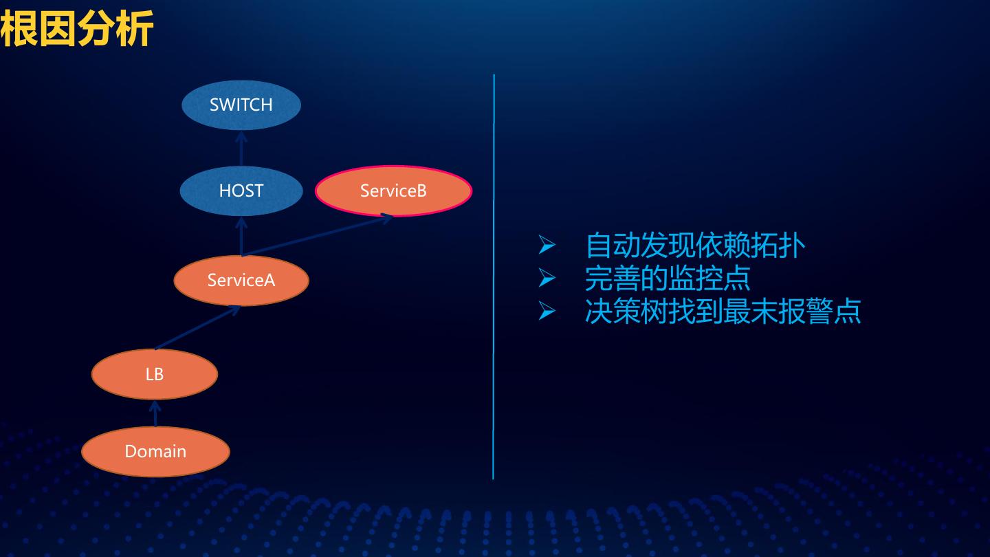27 .根因分析 SWITCH HOST ServiceB 自动发现依赖拓扑 ServiceA 完善的监控点 决策树找到最末报警点 LB Domain