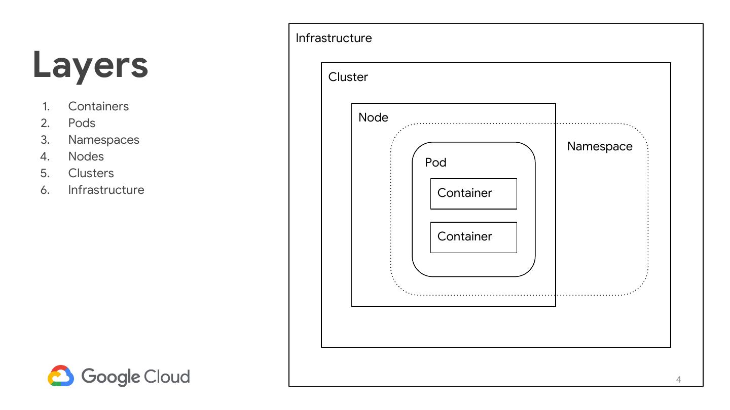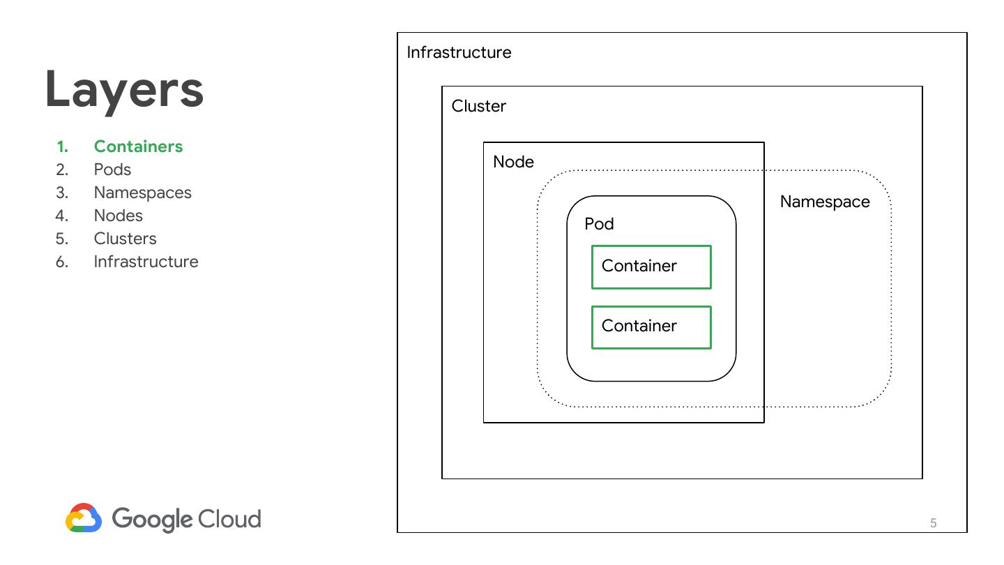 4 . Infrastructure Layers Cluster 1. Containers 2. Pods Node 3. Namespaces Namespace 4. Nodes Pod 5. Clusters 6. Infrastructure Container Container 4