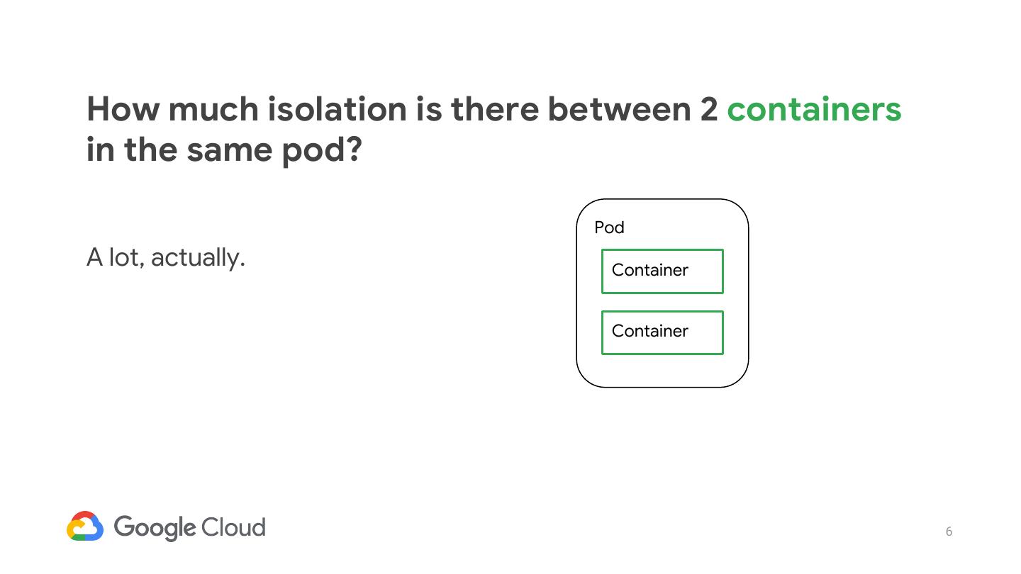 6 .How much isolation is there between 2 containers in the same pod? Pod A lot, actually. Container Container 6