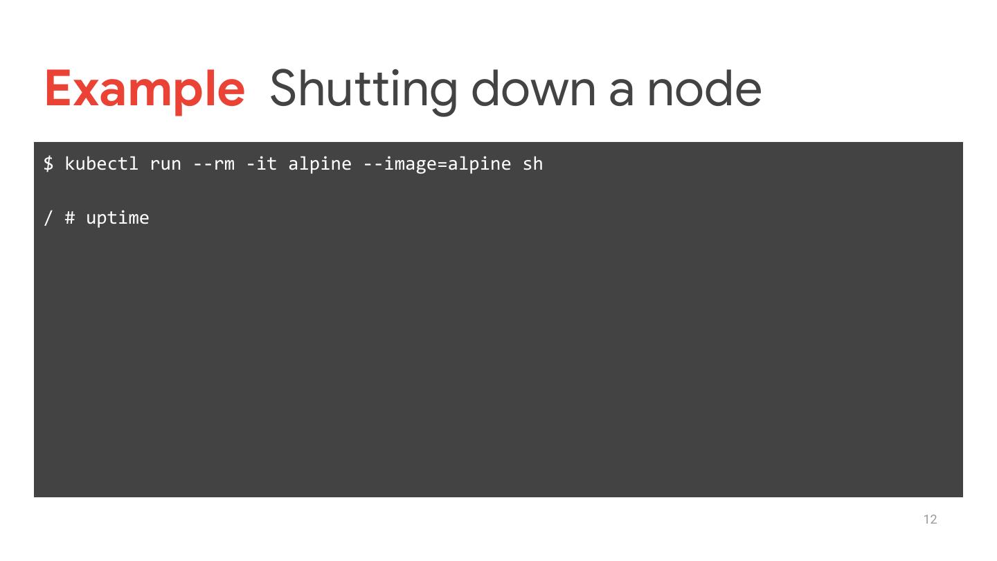12 .Example Shutting down a node $ kubectl run --rm -it alpine --image=alpine sh / # uptime 12