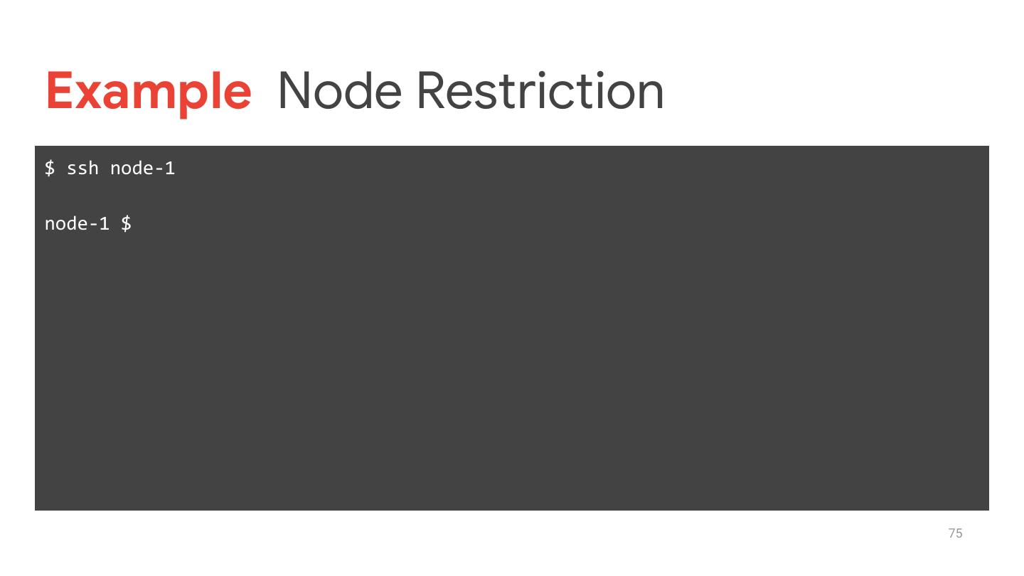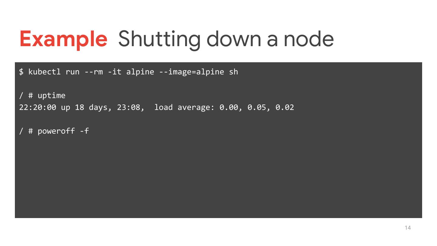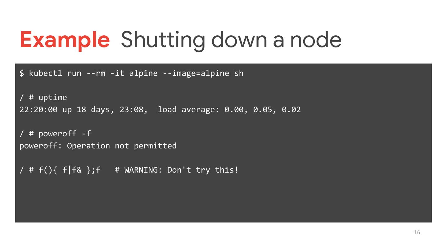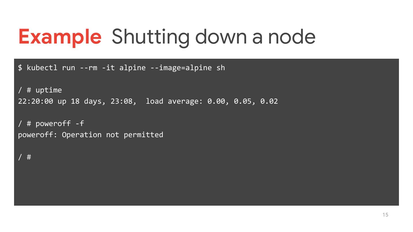 15 .Example Shutting down a node $ kubectl run --rm -it alpine --image=alpine sh / # uptime 22:20:00 up 18 days, 23:08, load average: 0.00, 0.05, 0.02 / # poweroff -f poweroff: Operation not permitted / # 15