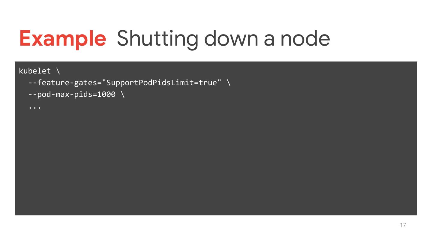 17 .Example Shutting down a node kubelet \ --feature-gates="SupportPodPidsLimit=true" \ --pod-max-pids=1000 \ ... 17