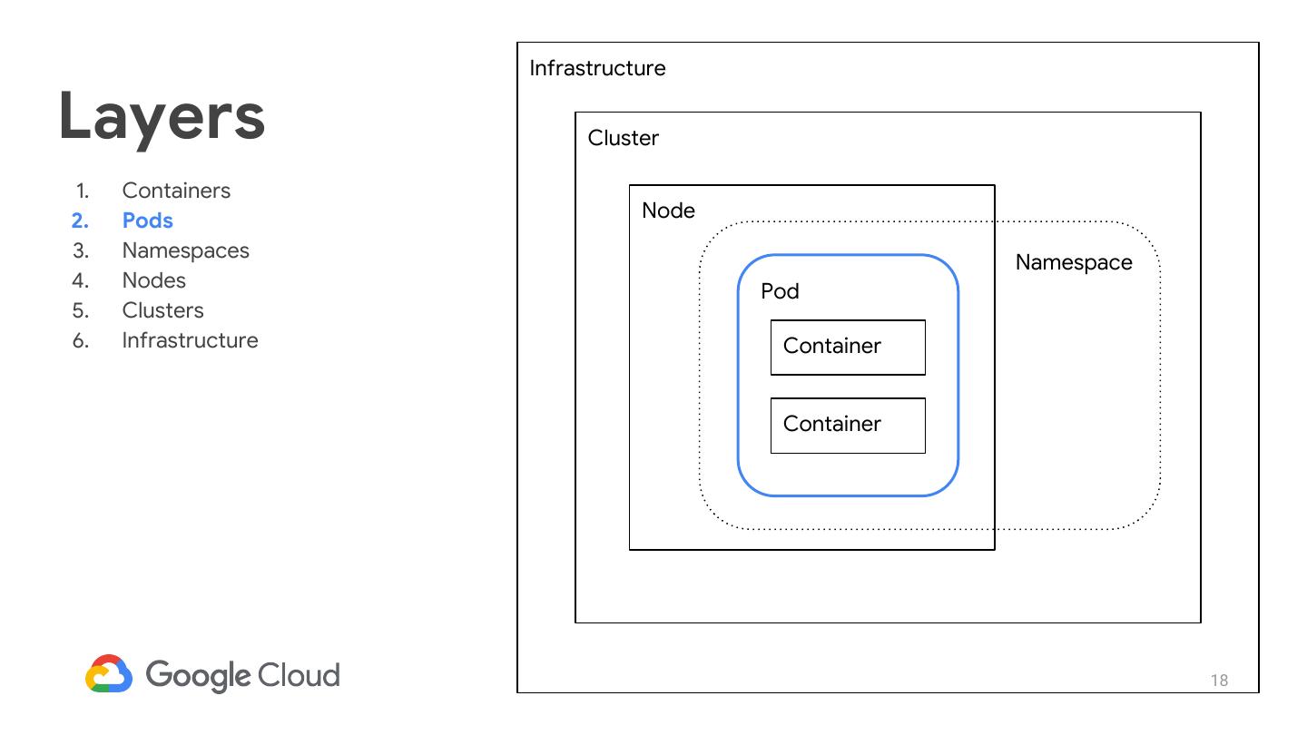 18 . Infrastructure Layers Cluster 1. Containers 2. Pods Node 3. Namespaces Namespace 4. Nodes Pod 5. Clusters 6. Infrastructure Container Container 18