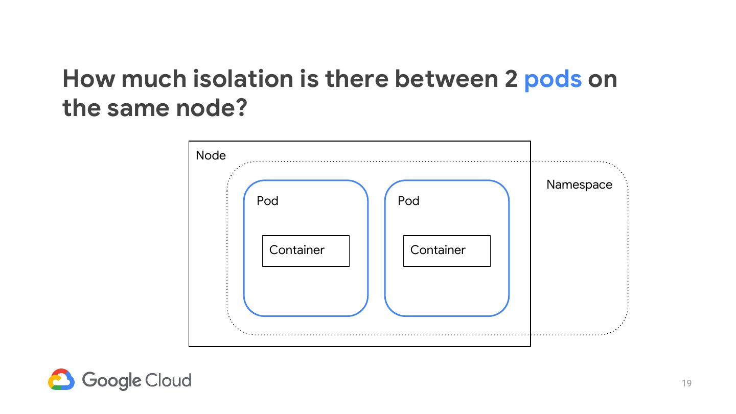 19 .How much isolation is there between 2 pods on the same node? Node Namespace Pod Pod Container Container 19