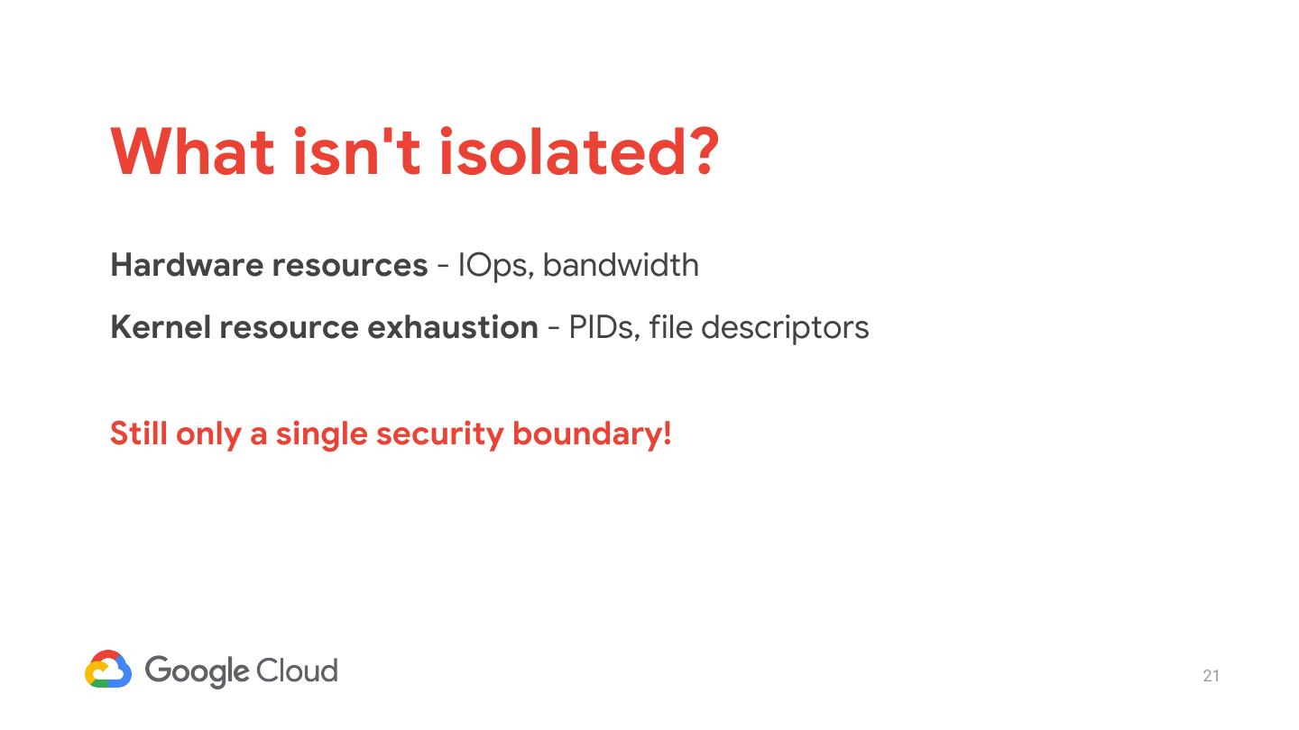 21 .What isn't isolated? Hardware resources - IOps, bandwidth Kernel resource exhaustion - PIDs, file descriptors Still only a single security boundary! 21