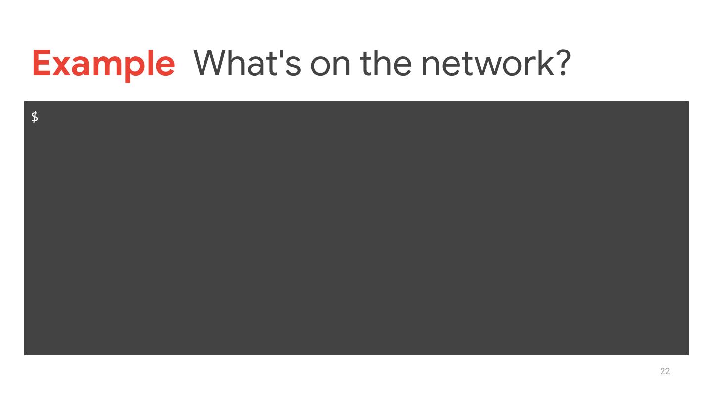 26 .Example What's on the network? $ kubectl run --rm -it alpine --image=alpine sh / # apk add --no-cache nmap ... OK: 18 MiB in 17 packages / # 26