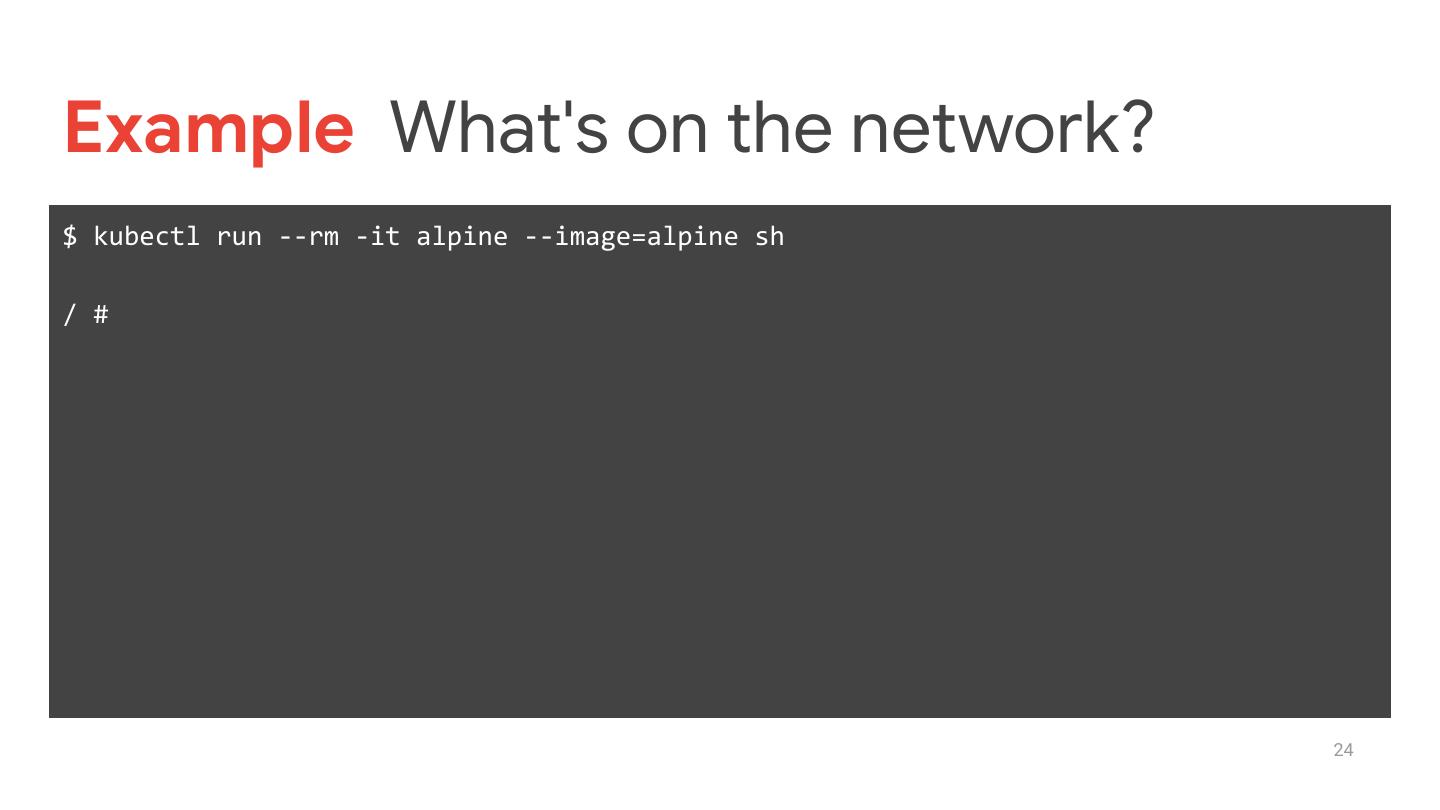 23 .Example What's on the network? $ kubectl run --rm -it alpine --image=alpine sh 23