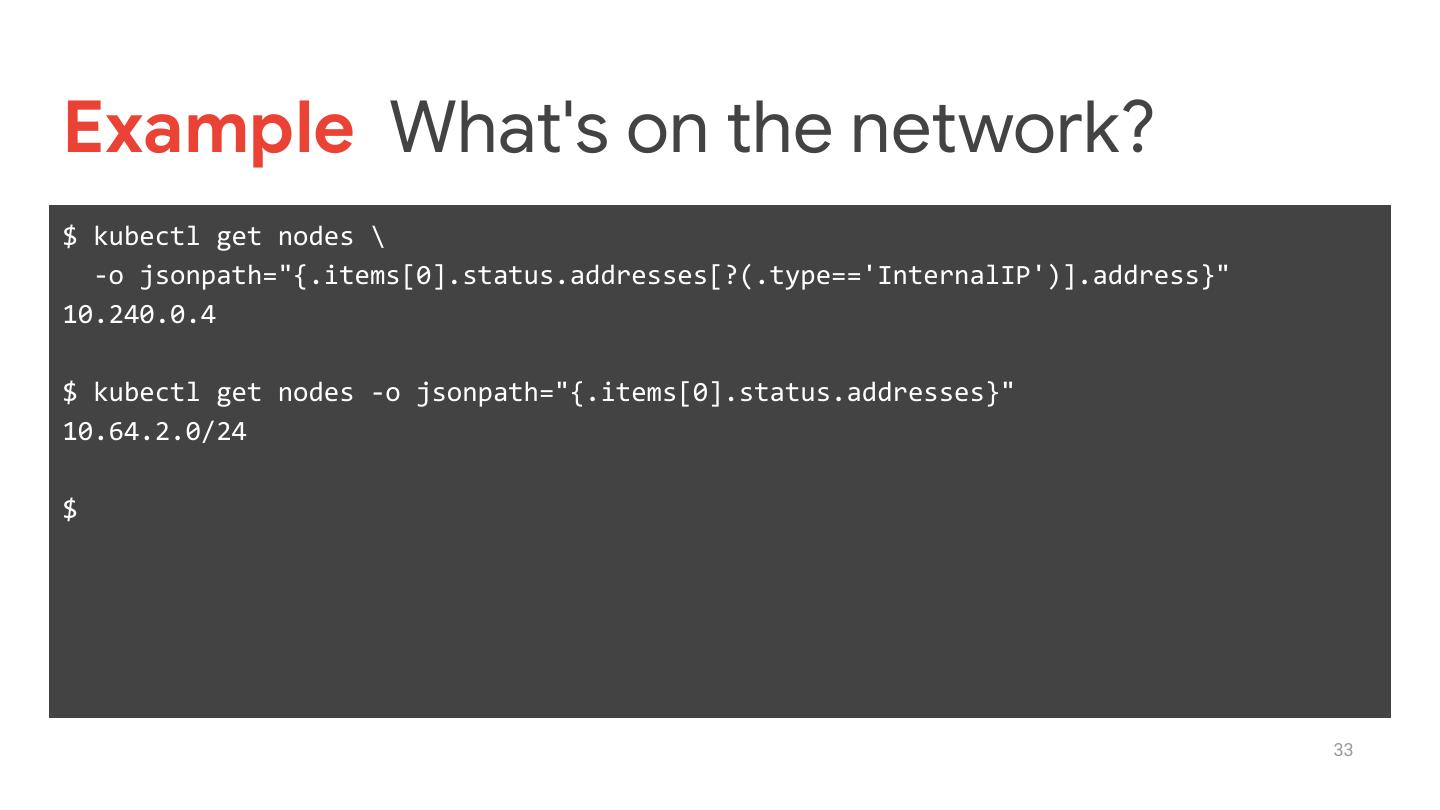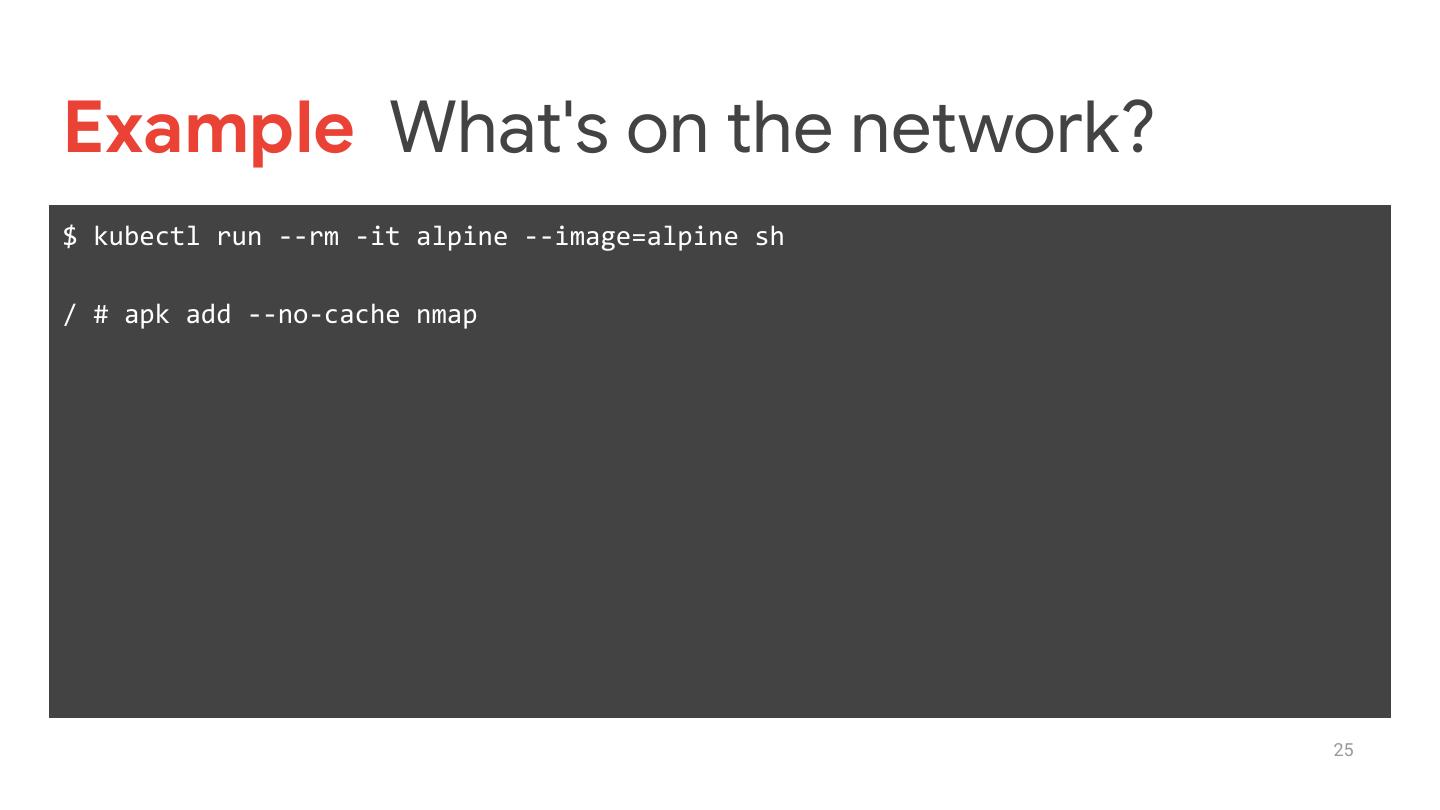 25 .Example What's on the network? $ kubectl run --rm -it alpine --image=alpine sh / # apk add --no-cache nmap 25