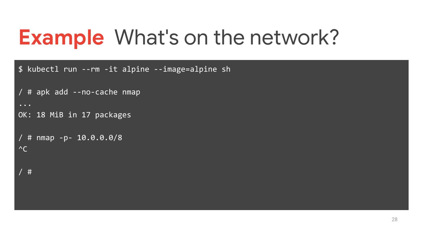 27 .Example What's on the network? $ kubectl run --rm -it alpine --image=alpine sh / # apk add --no-cache nmap ... OK: 18 MiB in 17 packages / # nmap -p- 10.0.0.0/8 27