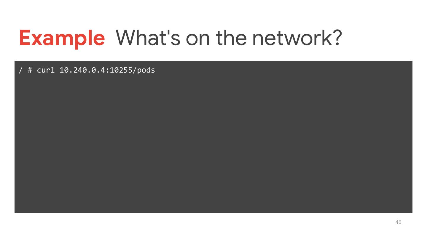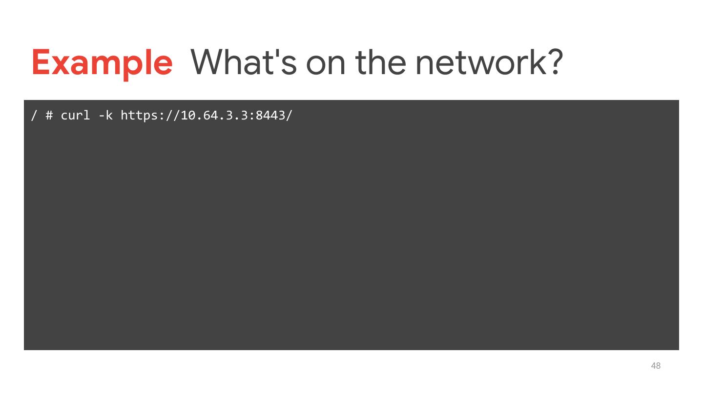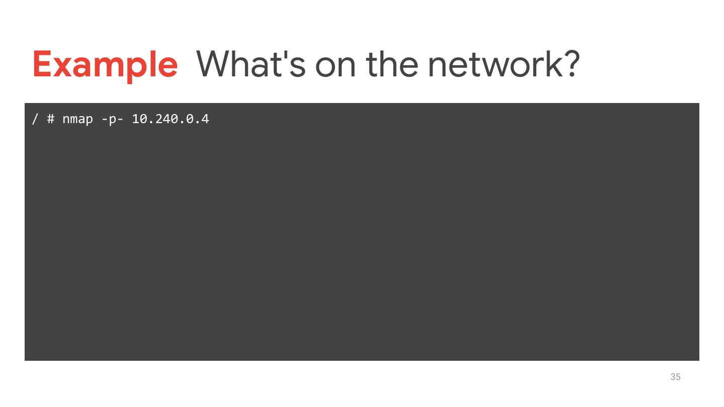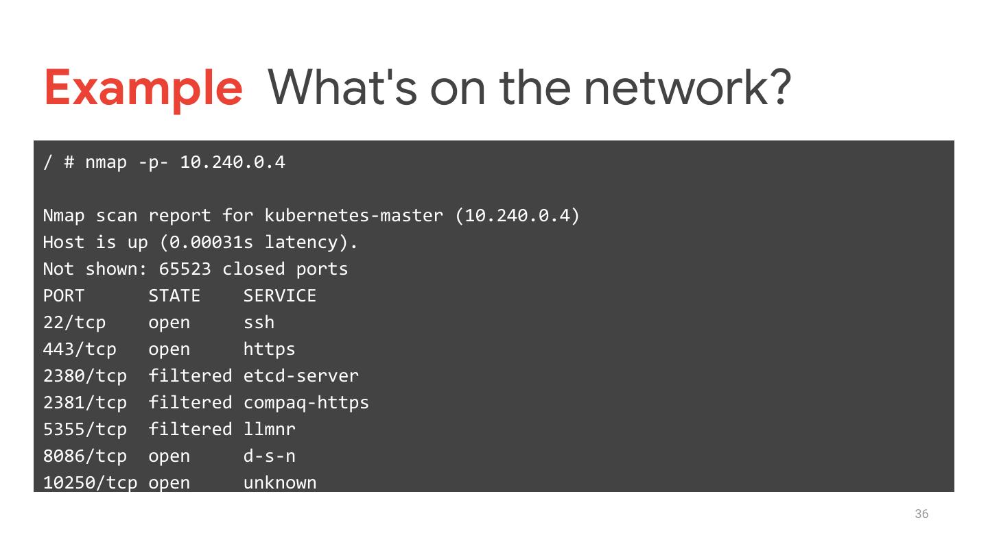 28 .Example What's on the network? $ kubectl run --rm -it alpine --image=alpine sh / # apk add --no-cache nmap ... OK: 18 MiB in 17 packages / # nmap -p- 10.0.0.0/8 ^C / # 28