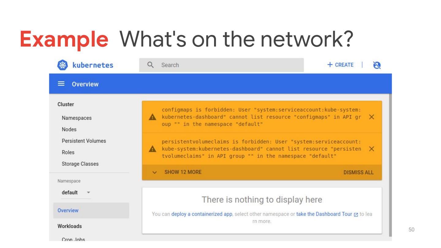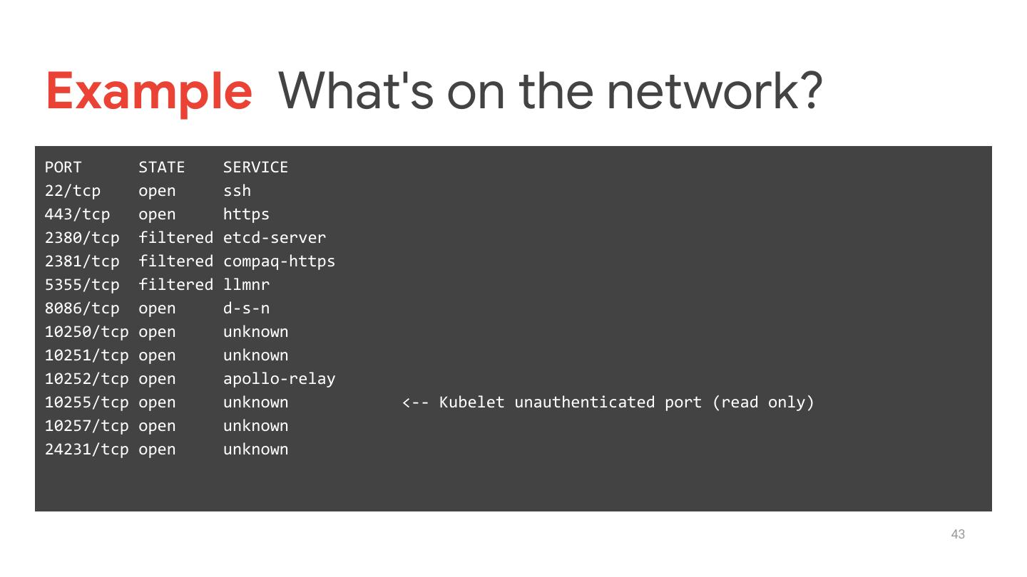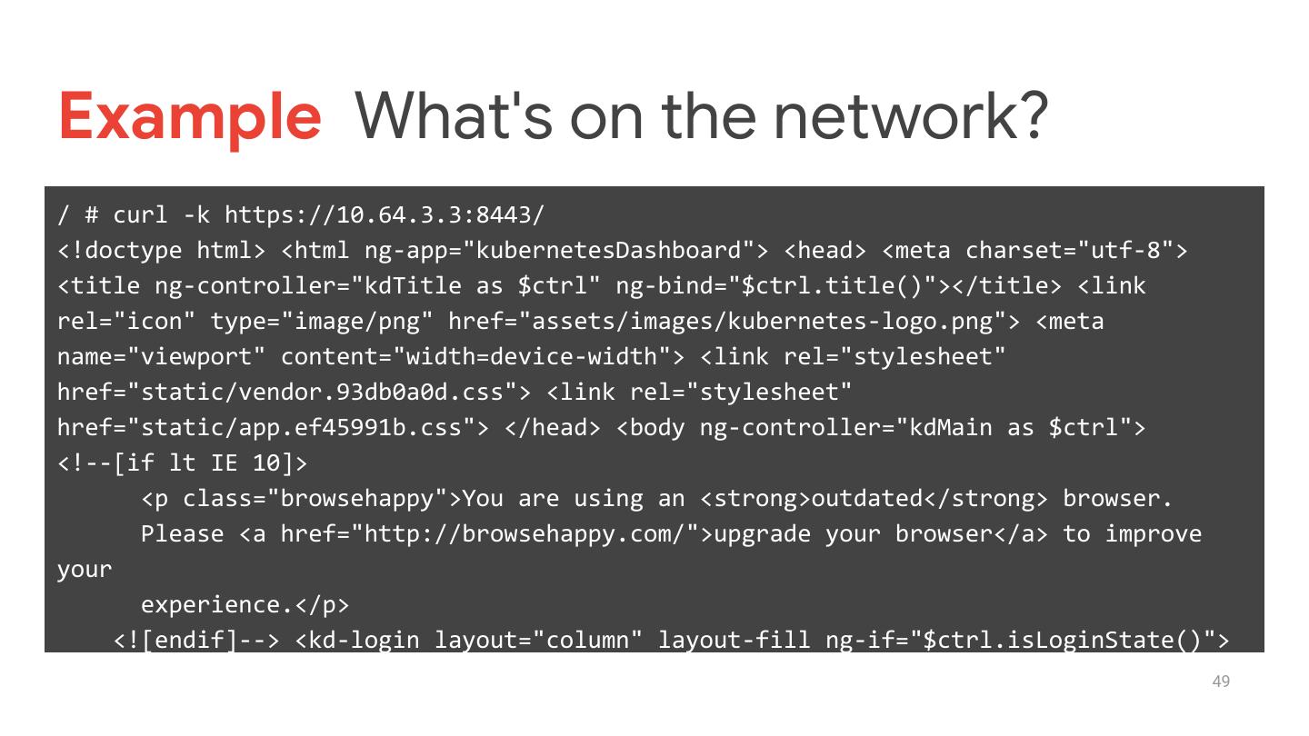 28 .Example What's on the network? $ kubectl run --rm -it alpine --image=alpine sh / # apk add --no-cache nmap ... OK: 18 MiB in 17 packages / # nmap -p- 10.0.0.0/8 ^C / # 28
