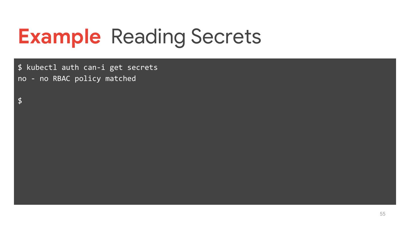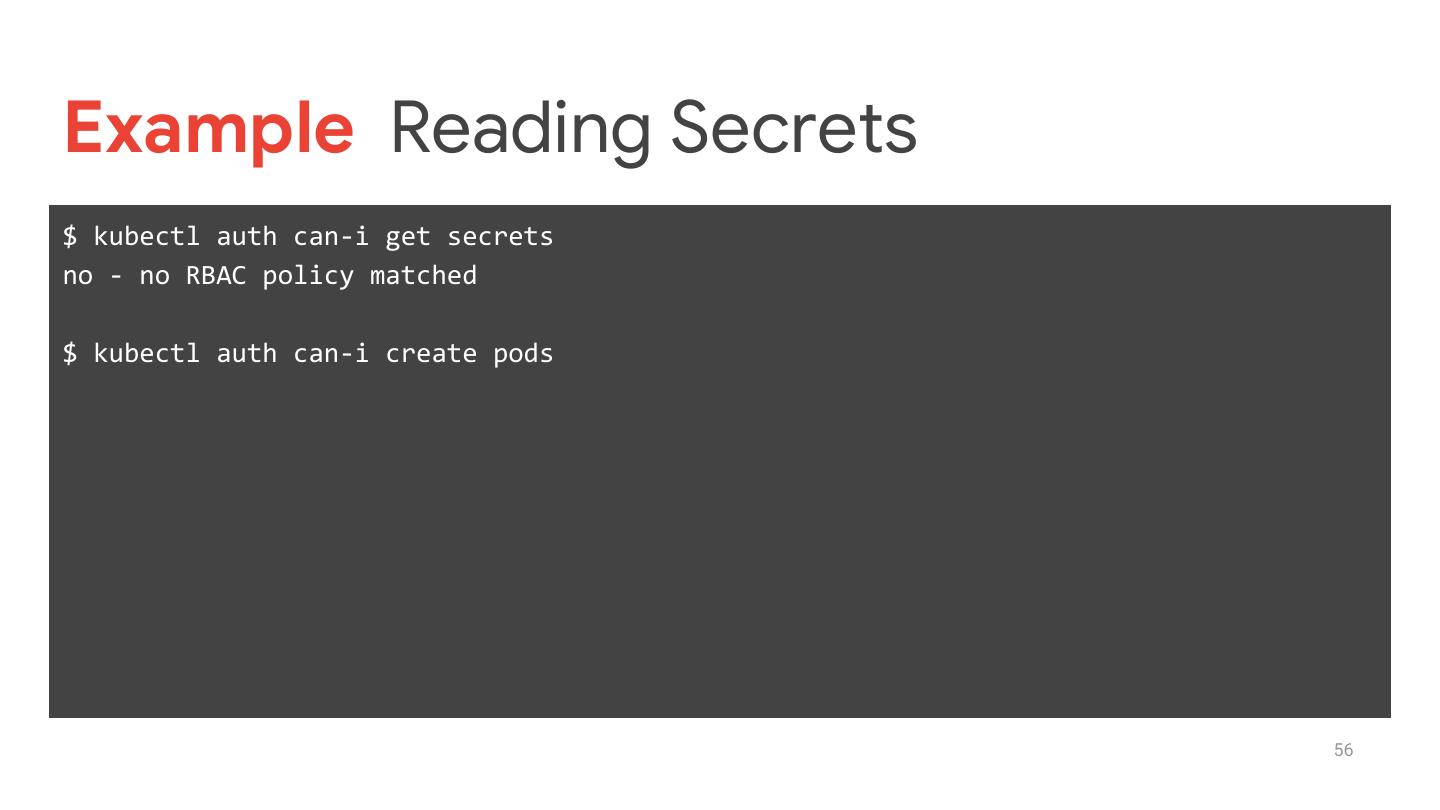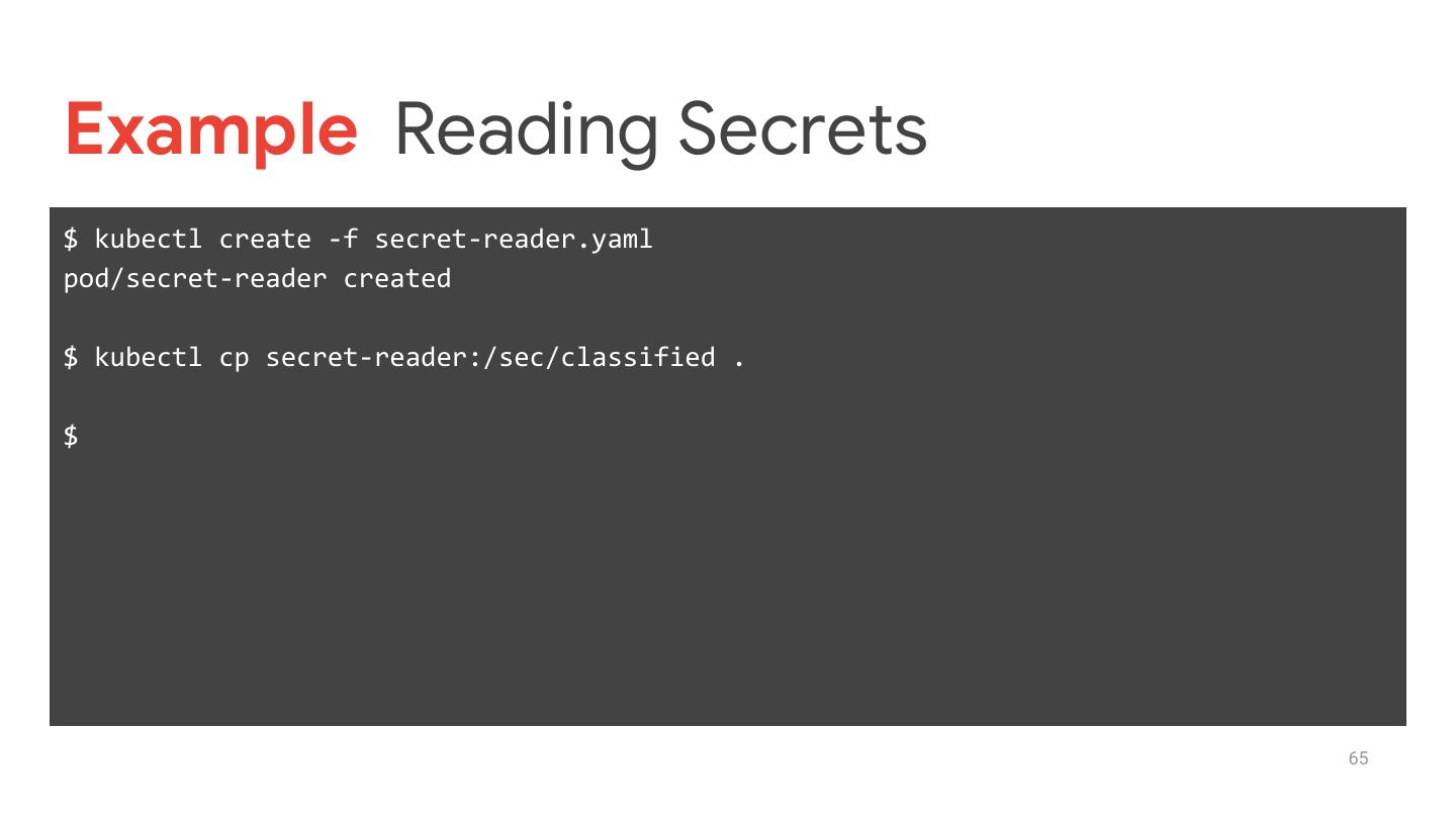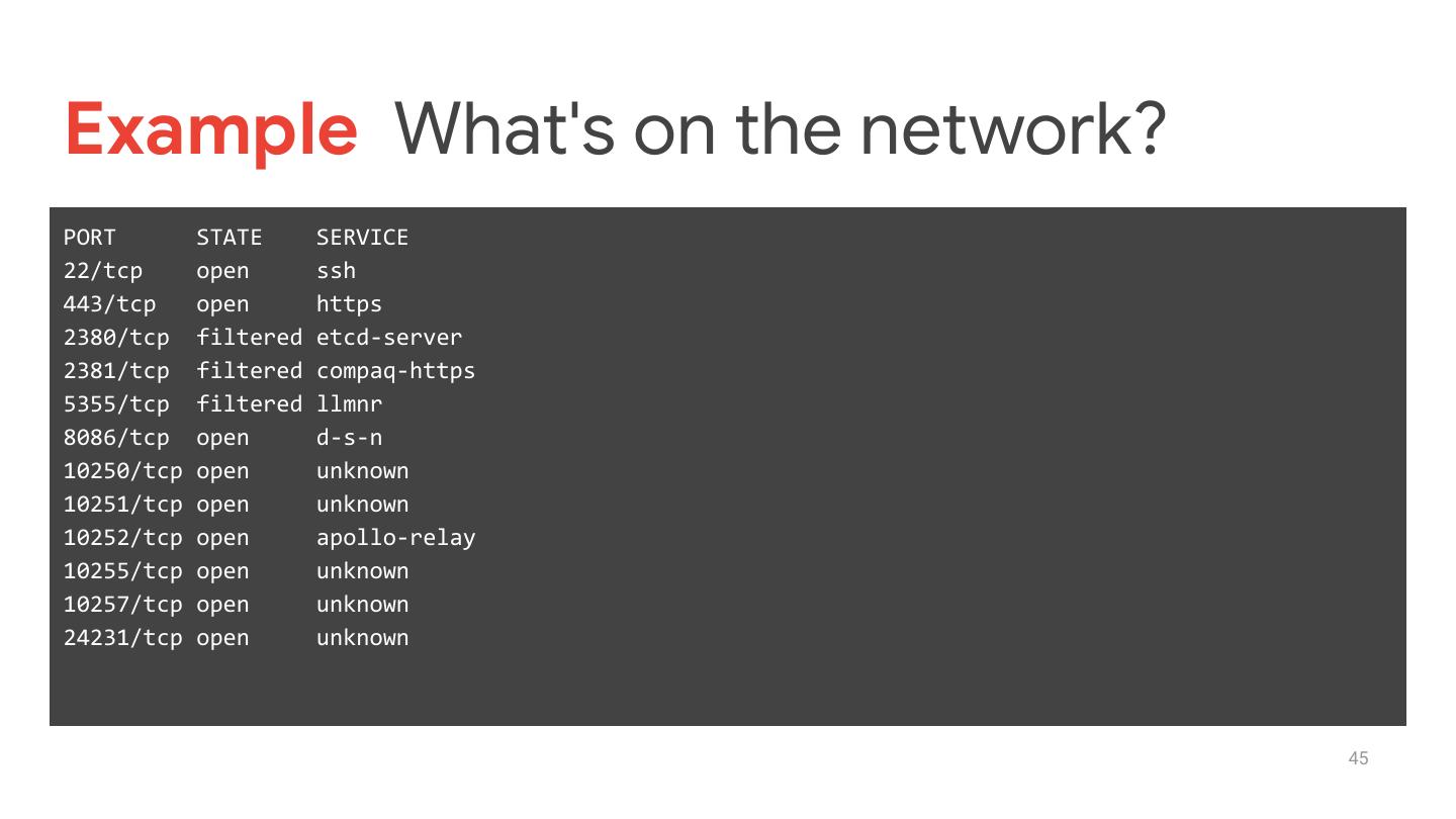 28 .Example What's on the network? $ kubectl run --rm -it alpine --image=alpine sh / # apk add --no-cache nmap ... OK: 18 MiB in 17 packages / # nmap -p- 10.0.0.0/8 ^C / # 28
