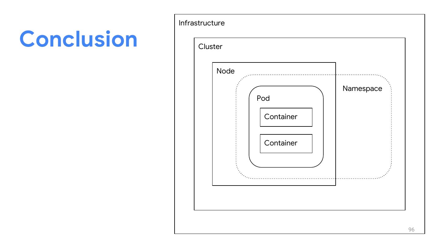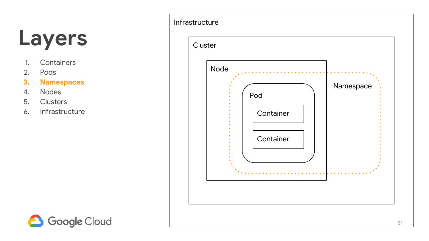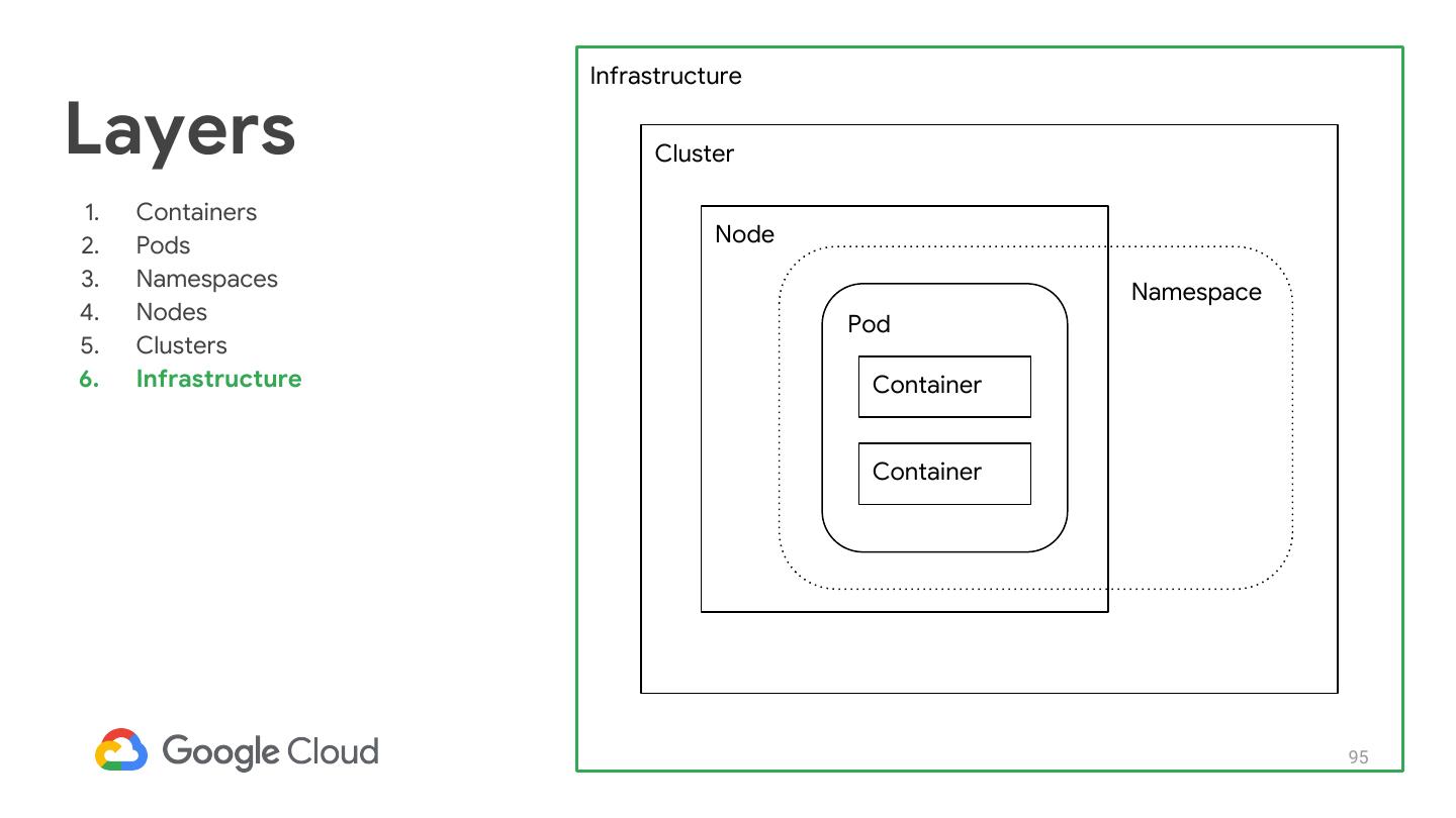 5 . Infrastructure Layers Cluster 1. Containers 2. Pods Node 3. Namespaces Namespace 4. Nodes Pod 5. Clusters 6. Infrastructure Container Container 5