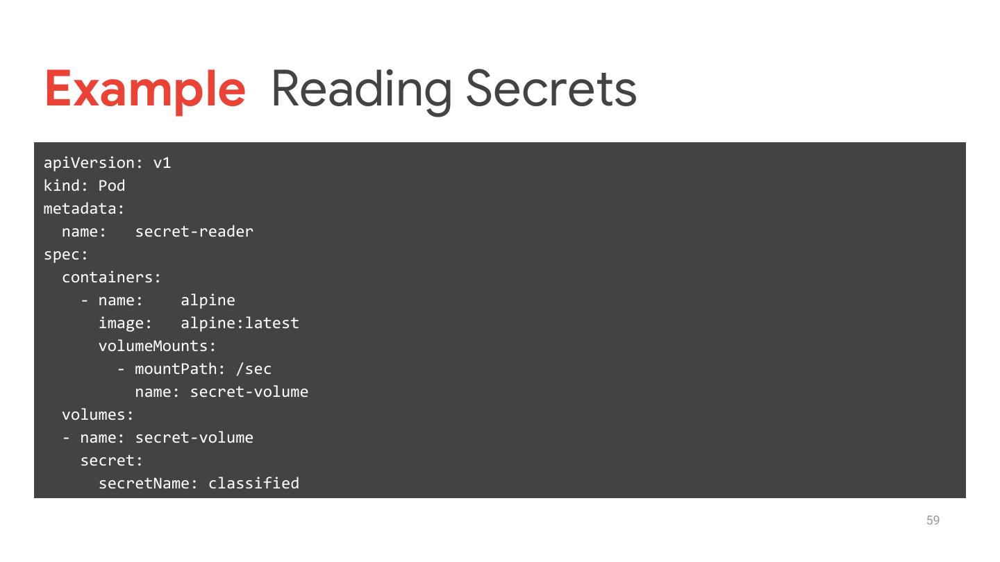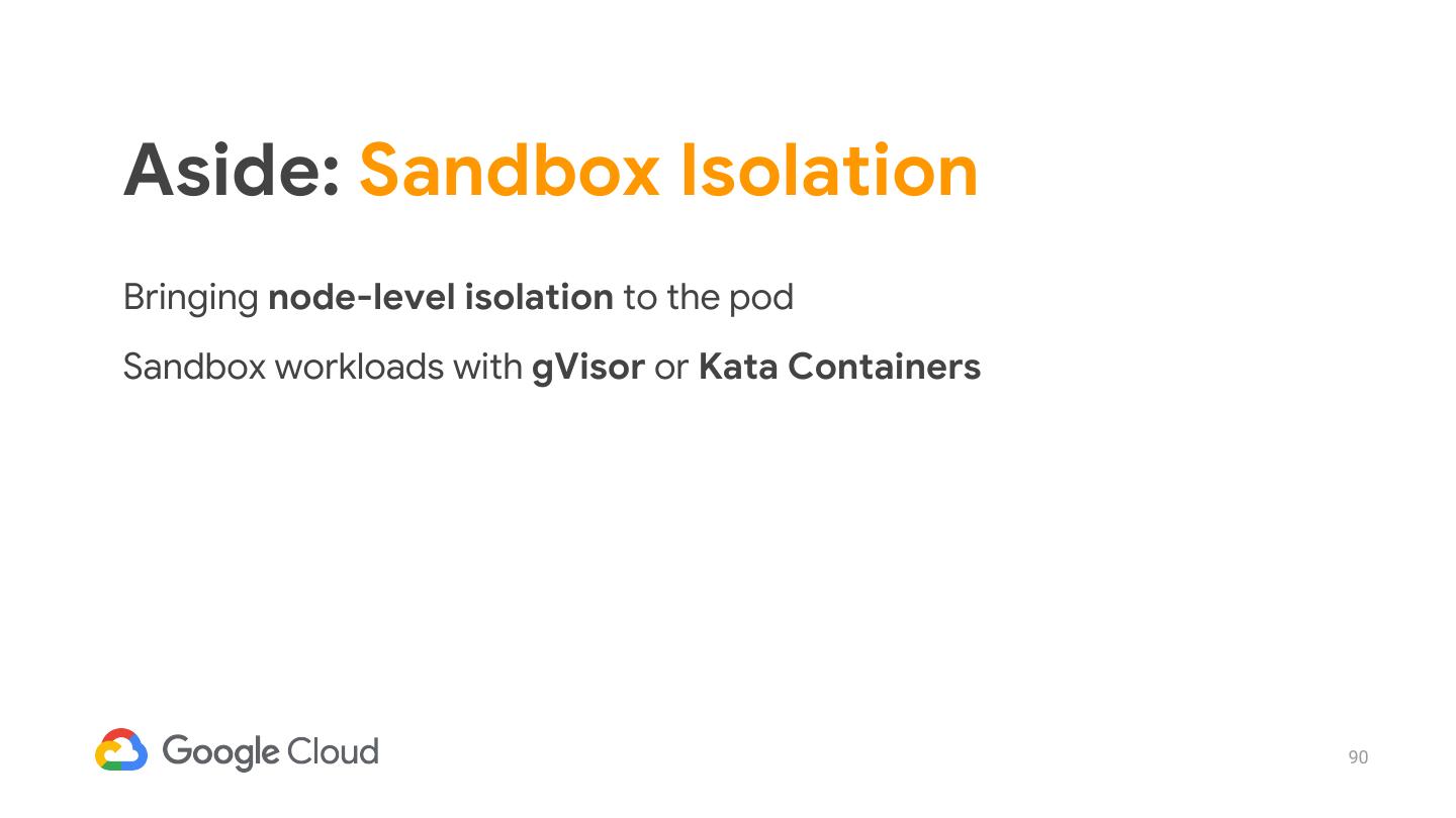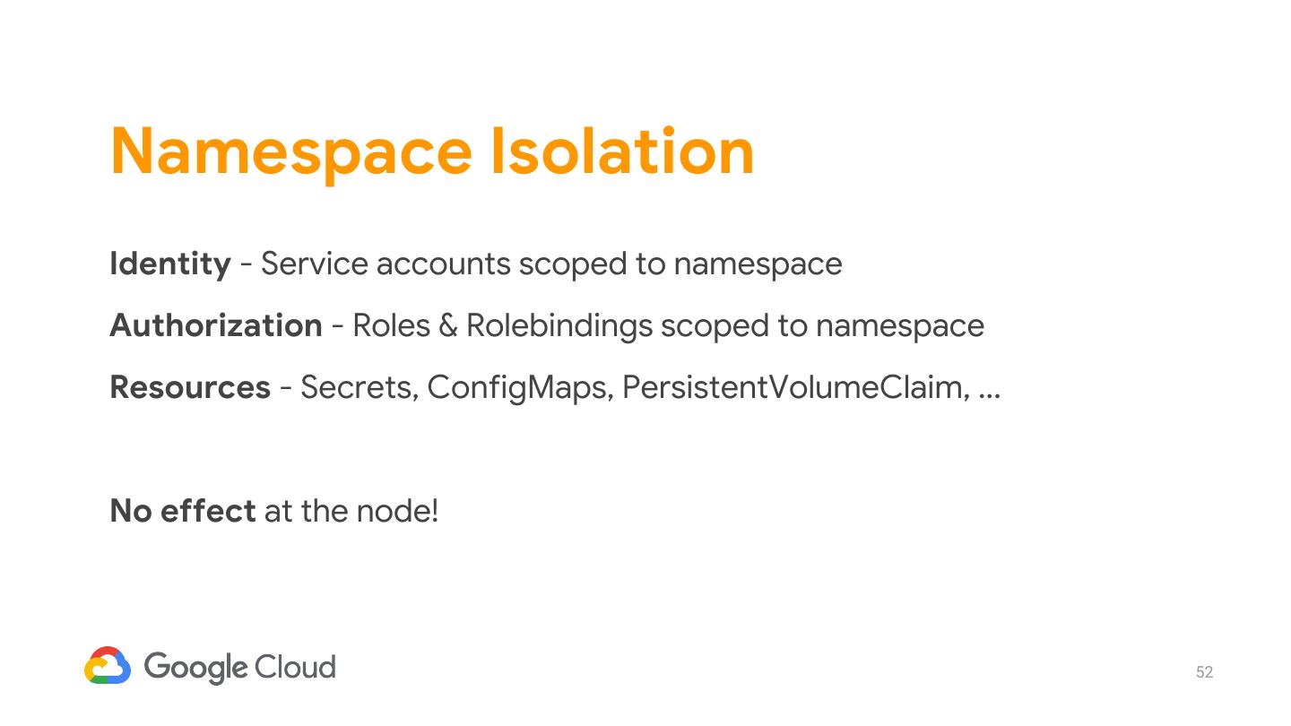20 .Pod Isolation Network - namespace, loopback, veth, IP address, NetworkPolicy Identity - ServiceAccounts Policy - PodSecurityPolicy, NetworkPolicy, SchedulingPolicy (WIP) Volumes - EmptyDir 20