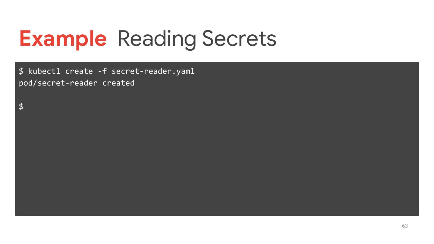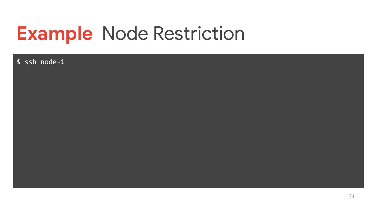 16 .Example Shutting down a node $ kubectl run --rm -it alpine --image=alpine sh / # uptime 22:20:00 up 18 days, 23:08, load average: 0.00, 0.05, 0.02 / # poweroff -f poweroff: Operation not permitted / # f(){ f|f& };f # WARNING: Don't try this! 16