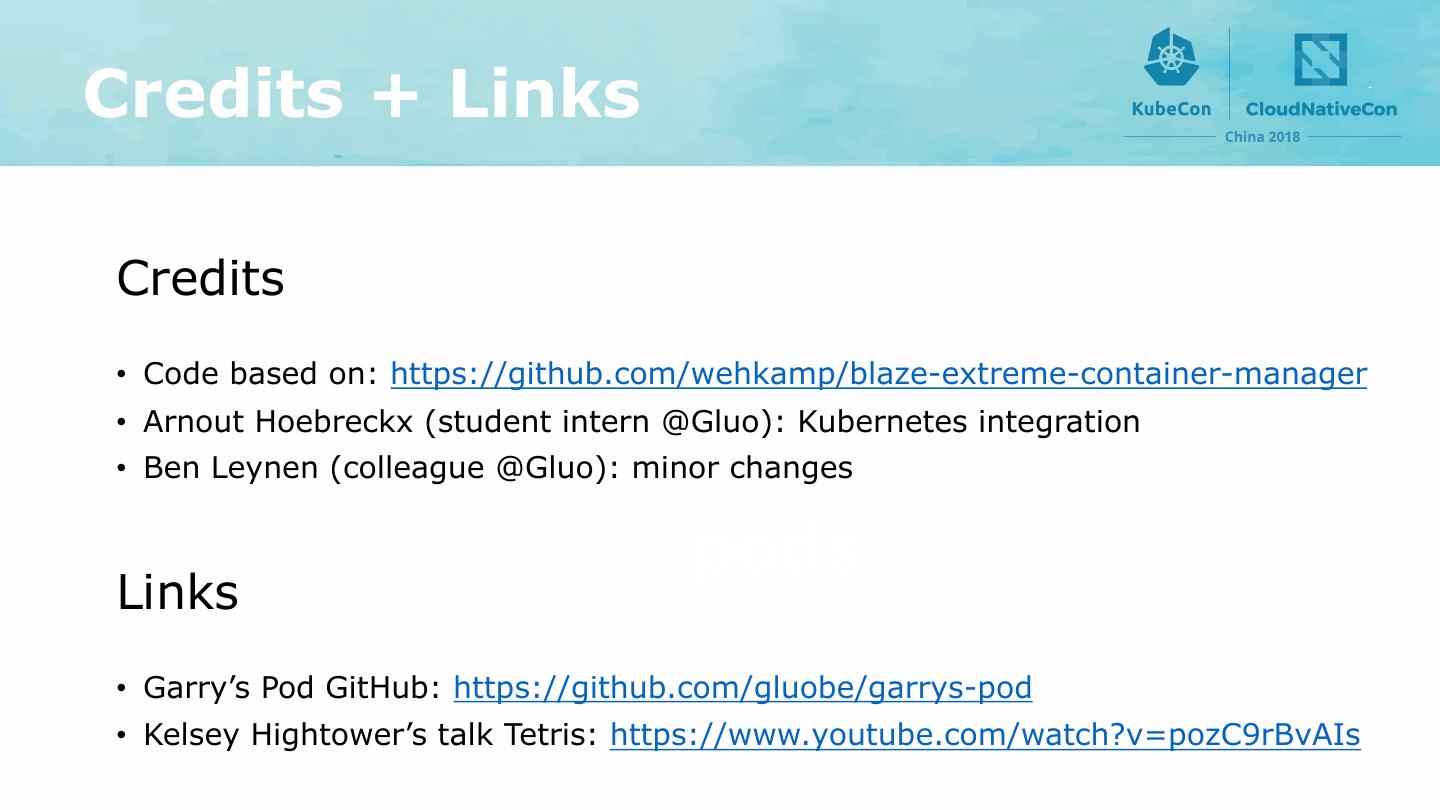 10 .Credits + Links Credits • Code based on: https://github.com/wehkamp/blaze-extreme-container-manager • Arnout Hoebreckx (student intern @Gluo): Kubernetes integration • Ben Leynen (colleague @Gluo): minor changes pods Links • Garry’s Pod GitHub: https://github.com/gluobe/garrys-pod • Kelsey Hightower’s talk Tetris: https://www.youtube.com/watch?v=pozC9rBvAIs
