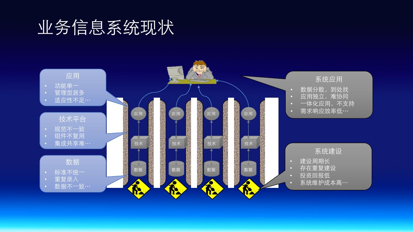 3 .业务信息系统现状 应⽤ 系统应⽤ • 功能单⼀ • 数据分散,到处找 • 管理型居多 • 应⽤独⽴,难协同 • 适应性不⾜… • ⼀体化应⽤,不⽀持 应⽤ 应⽤ 应⽤ 应⽤ • 需求响应效率低… 技术平台 • 规范不⼀致 • 组件不复⽤ • 集成共享难… 技术 技术 技术 技术 系统建设 数据 • 建设周期⻓ 数据 数据 数据 数据 • 存在重复建设 • 标准不统⼀ • 投资回报低 • 重复录⼊ • 系统维护成本⾼… • 数据不⼀致…