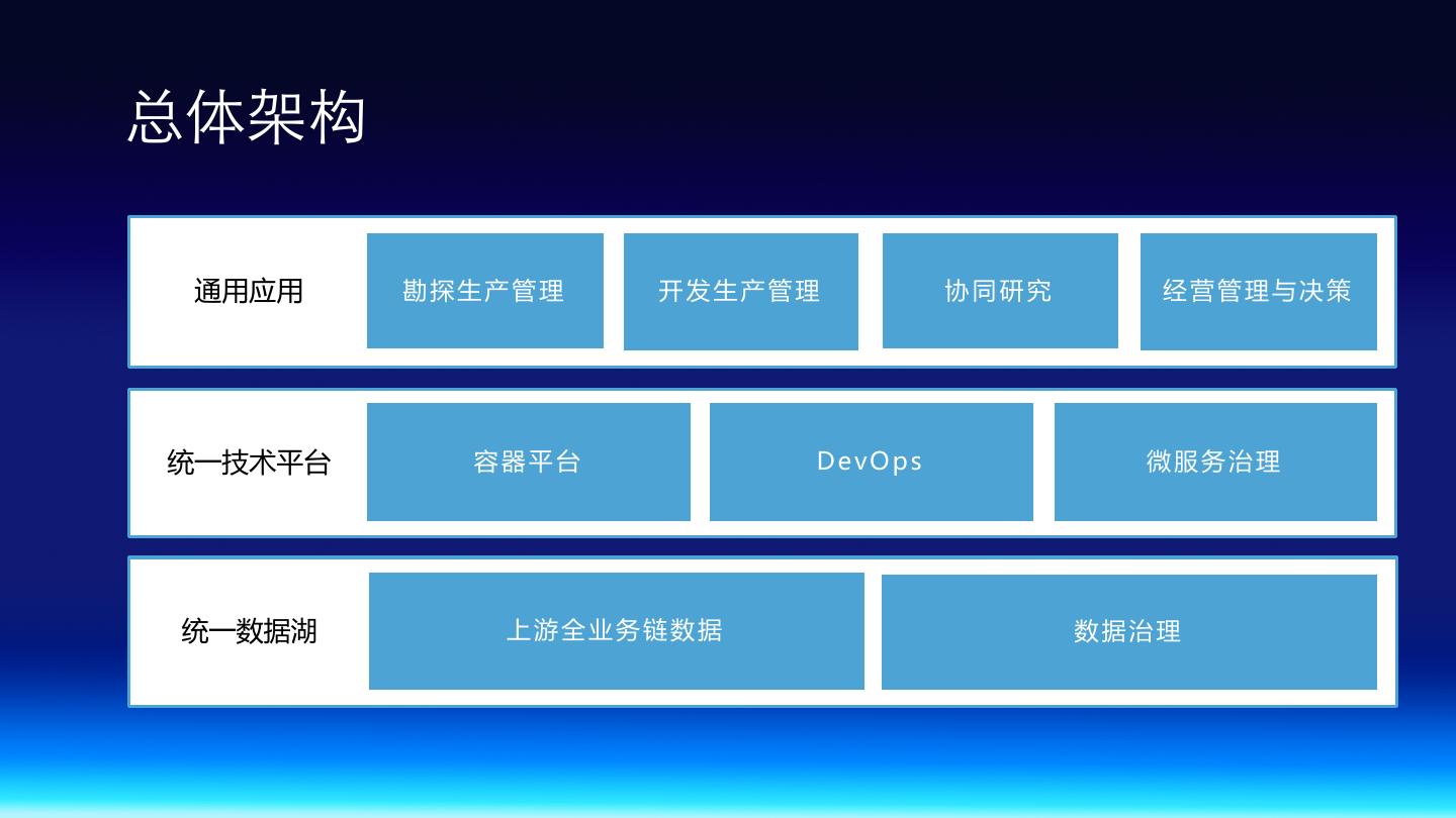 4 .总体架构 通用应用 勘探生产管理 开发生产管理 协同研究 经营管理与决策 统一技术平台 容器平台 DevOps 微服务治理 统一数据湖 上游全业务链数据 数据治理